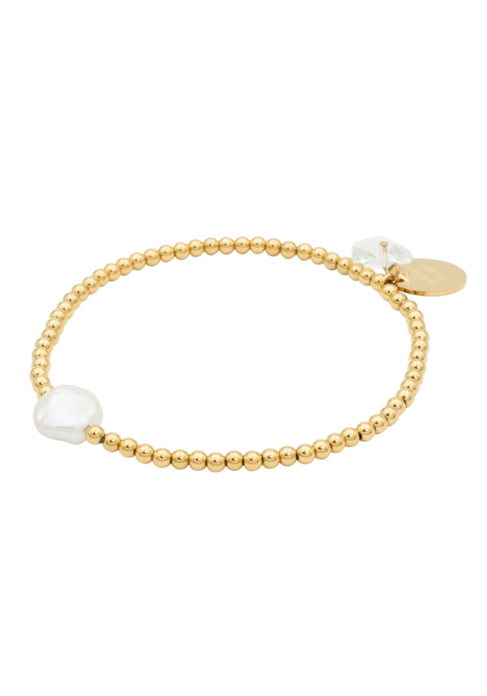 De armband "Maxime" van Embrace is voorzien van elastische 14K vergulde bolletjes met 3mm grote roestvrij stalen bolletjes en een onbewerkte zoetwaterparel aan de voorkant.