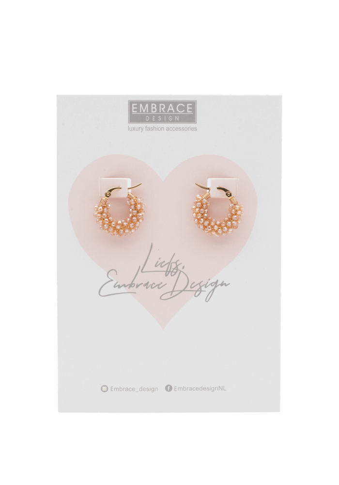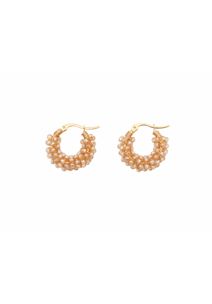 Champagnegouden oorbellen met verguld stainless steel en glaskraaltjes. Licht in gewicht, elegant en ideaal voor dagelijks gebruik.