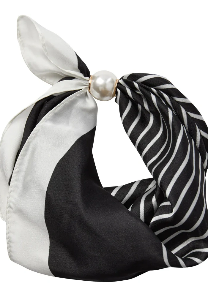 De Pearl scarf van Co´Couture in black stripe. De stof heeft een glad oppervlak en de sjaal heeft een grote decoratieve parel in het midden.