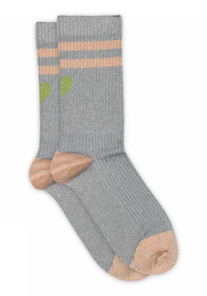 Deze glitter sokken van MPwoman, model Elga in de kleur Stone Blue, hebben een zachte katoenen binnenzijde voor optimaal draagcomfort zonder jeuk. Het ontwerp is voorzien van diagonale strepen op het been en een hartmotief aan de achterkant. Een speels en stijlvol item dat elke outfit een vrouwelijke touch geeft.