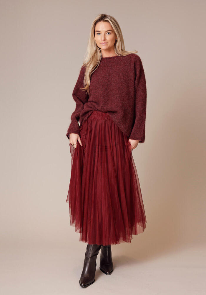 De Burgundy rok van Noman’sland straalt warmte en diepte uit. Deze rijke bordeauxrode tint past perfect in de herfst en winter, maar laat zich ook prachtig combineren met lichte tinten in het voorjaar. Denk aan een crèmekleurige coltrui, een camel trenchcoat en een paar leren laarsjes voor een verfijnde city look.