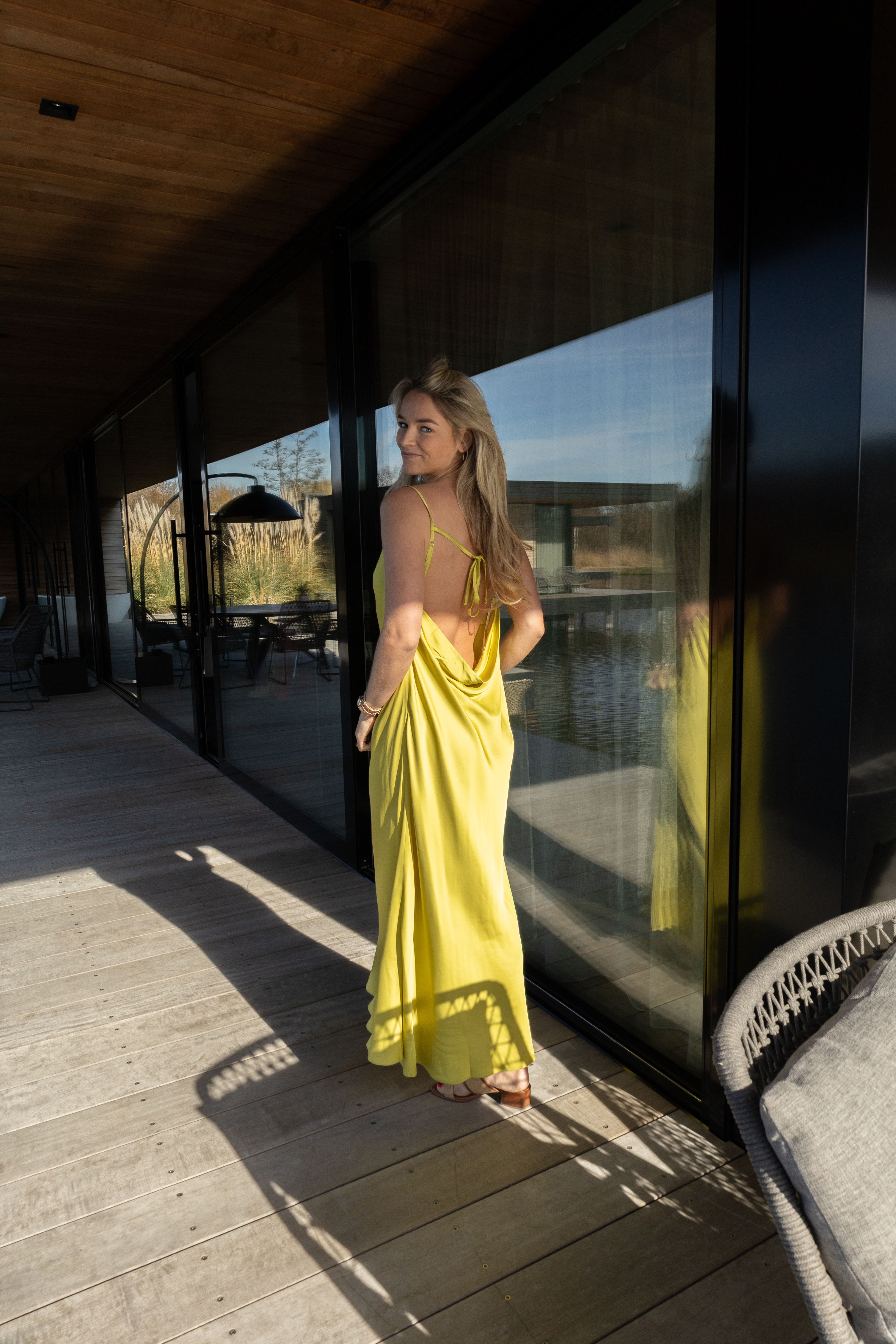 De Nema dress is een elegante, lange satijnen jurk in een frisse lime kleur die soepel langs het lichaam valt. De subtiele watervalhals zorgt voor een zachte, luxe uitstraling, terwijl de open rug met fijne bandjes de jurk een verfijnde en vrouwelijke touch geeft.