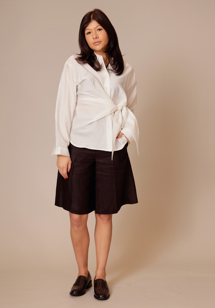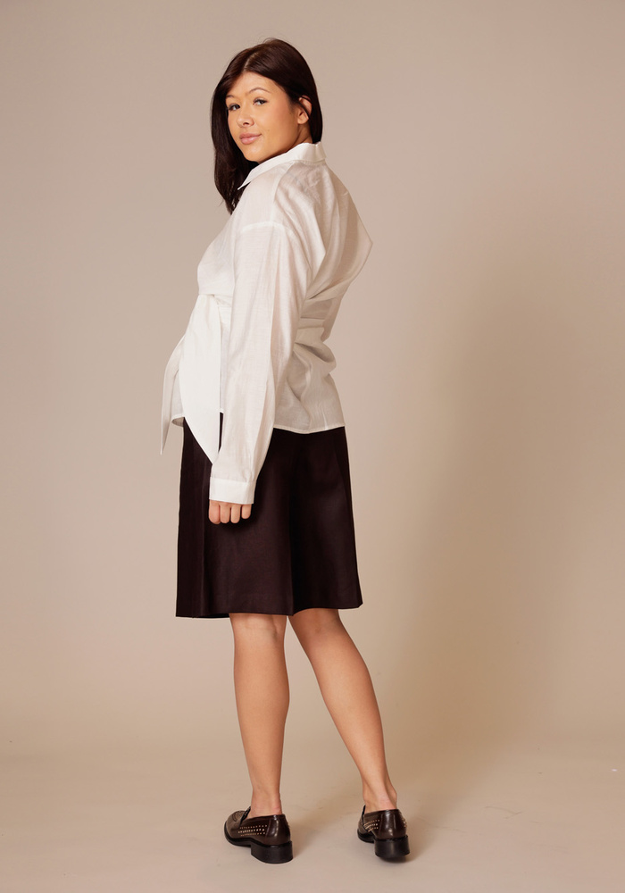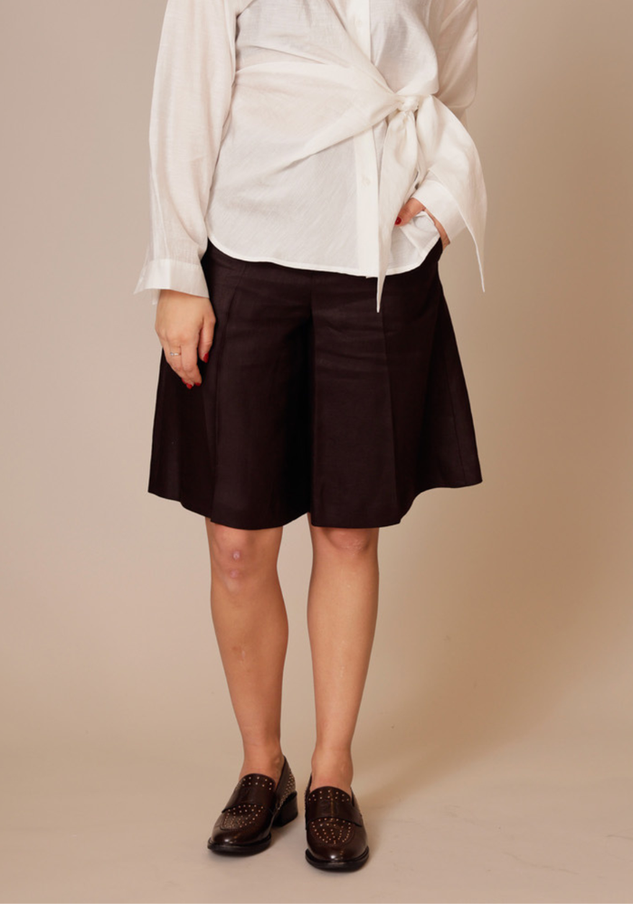 De Govern pants van Drykorn is een bermuda in een donkerbruine kleur. De broek heeft een knoop -en ritssluiting.