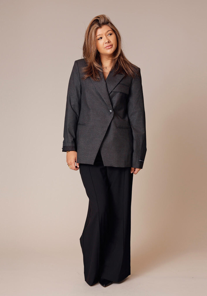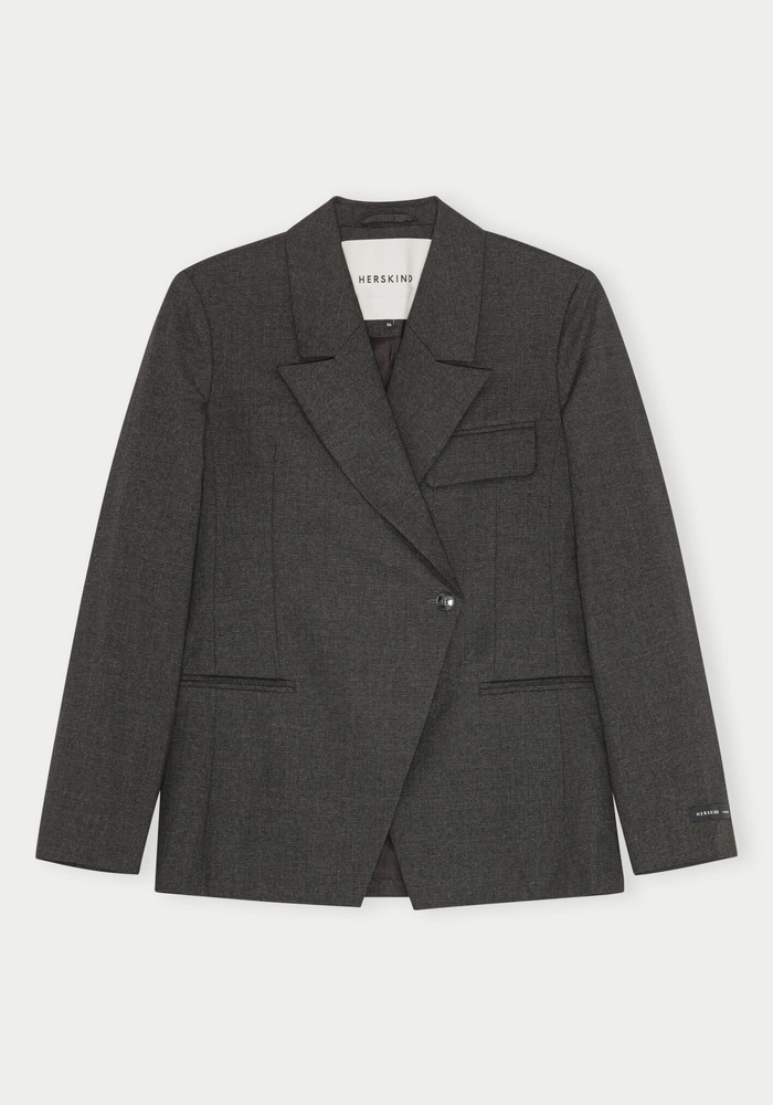 De Oprah blazer van Herskind is een getailleerde blazer met een asymmetrische sluiting aan de voorkant, afgeronde zomen, mouwen met twee naden en een enkele split aan de achterkant.