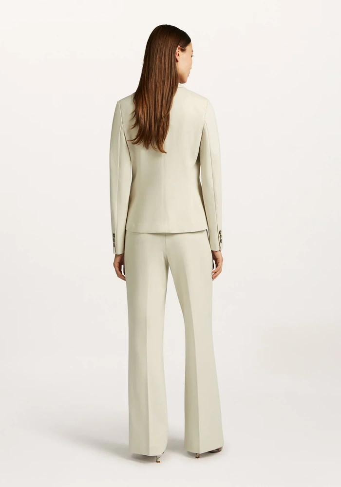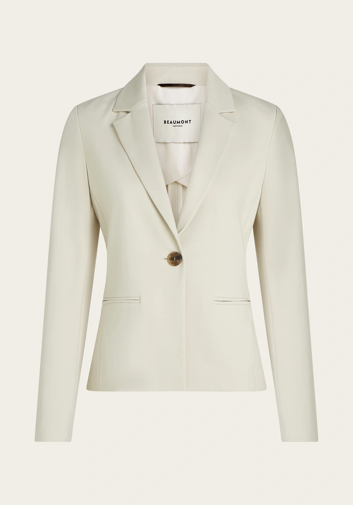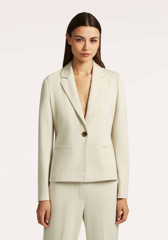 Deze blazer is gemaakt van comfortabele jersey stof en sluit met één knoop aan de voorkant. De mouwen zijn voorzien van een split met drie logoknopen en dubbele paspelzakken voor een stijlvolle uitstraling. De kruisvoering zorgt voor extra draagcomfort en een nette afwerking.