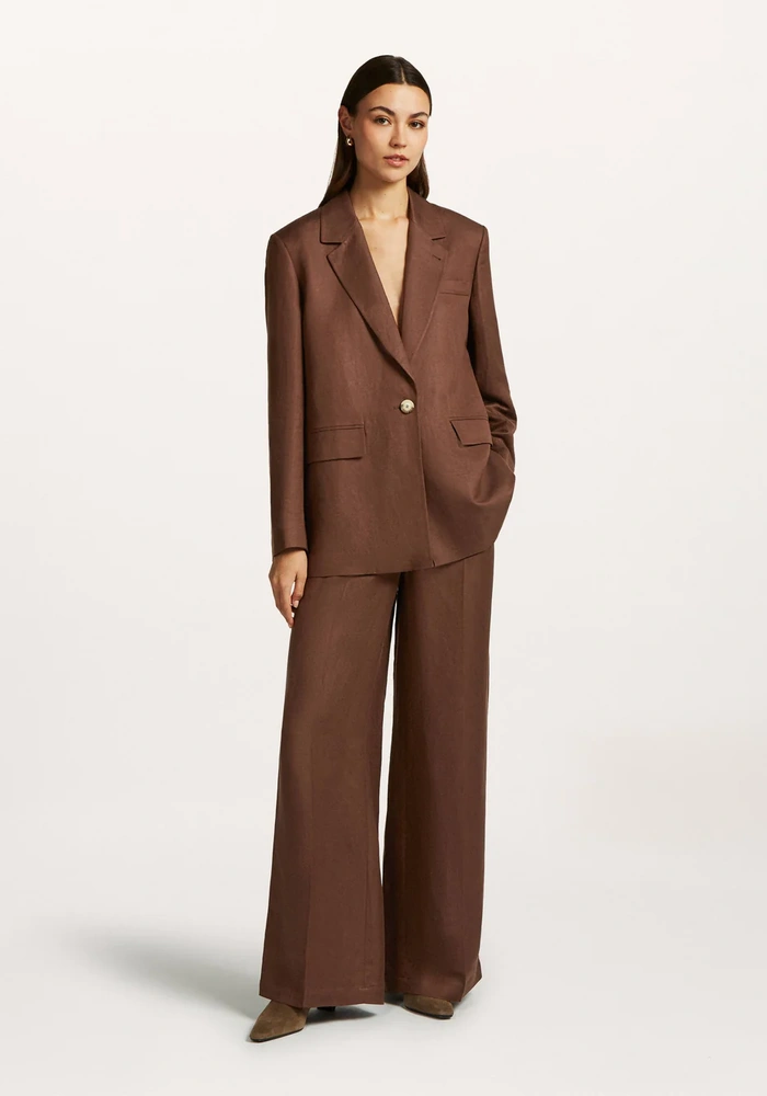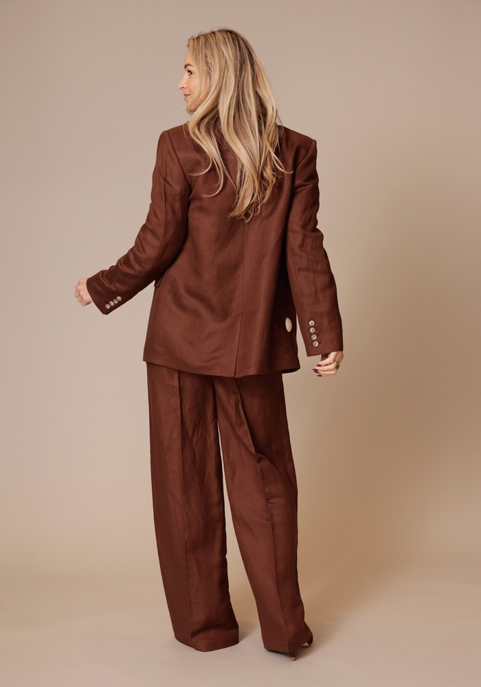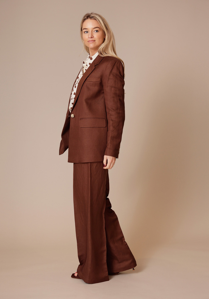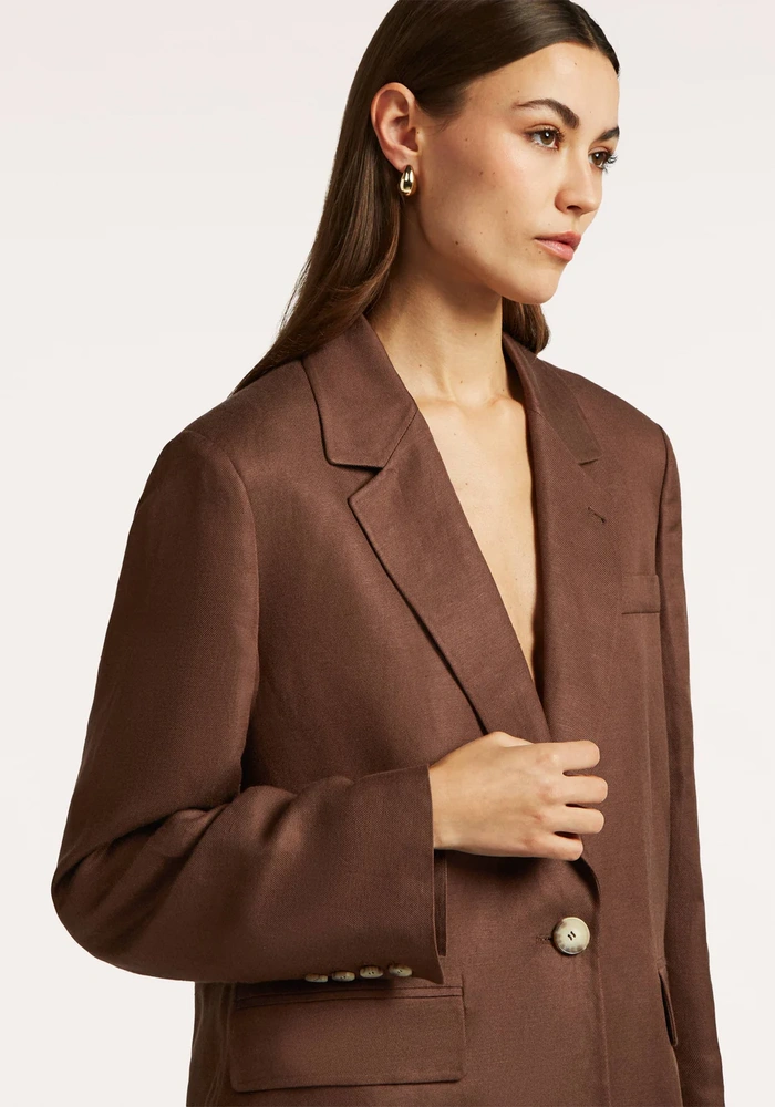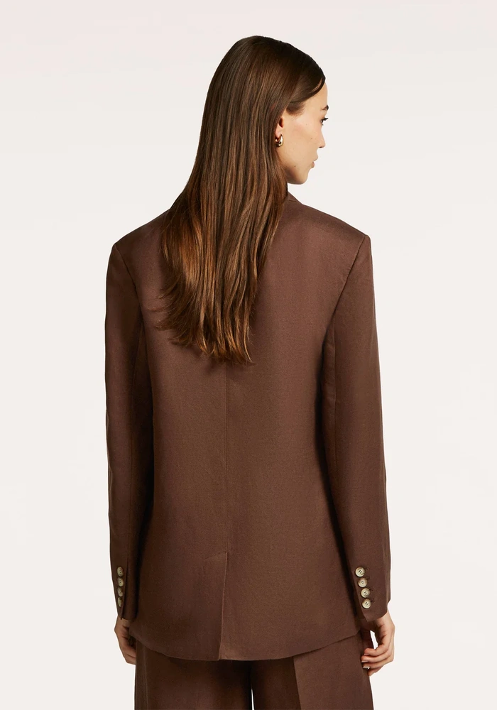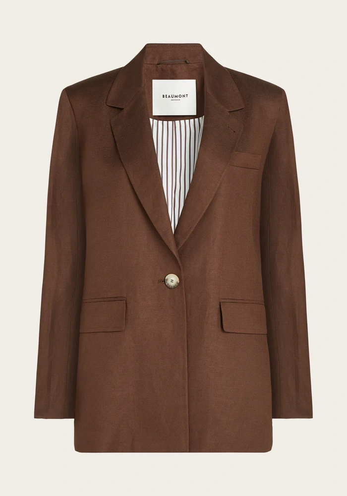Deze blazer is gemaakt van een keperstof linnen katoenmix en heeft een stijlvolle, tijdloze uitstraling. Het model is voorzien van één knoop middenvoor, een borstzak, praktische zakken en mouwen met een split en vier knopen. De blazer is volledig gevoerd met een streepvoering voor een verfijnde en moderne finishing touch.