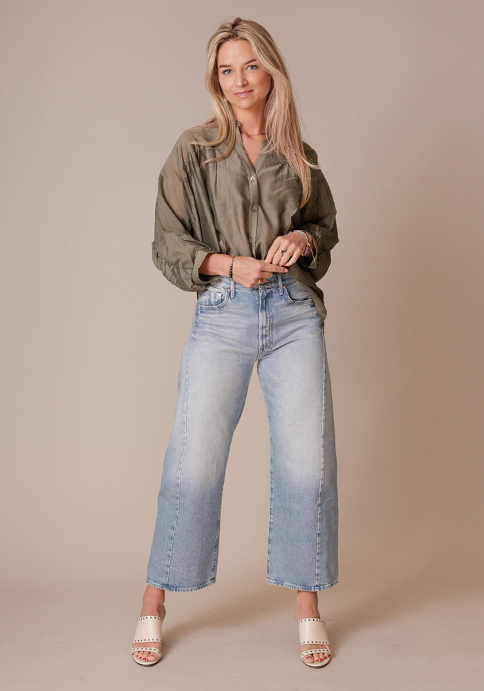 De Merel Blouse is een luchtige, vrouwelijke blouse in een zachte, olijfgroene tint met een subtiel transparante uitstraling. De blouse heeft een losvallende pasvorm, opstaande kraag en mooie plooidetails op de schouders en rug die zorgen voor een speels volume. Gemaakt van een licht en enigszins doorschijnend materiaal, is dit het perfecte item voor een verfijnde maar nonchalante look.