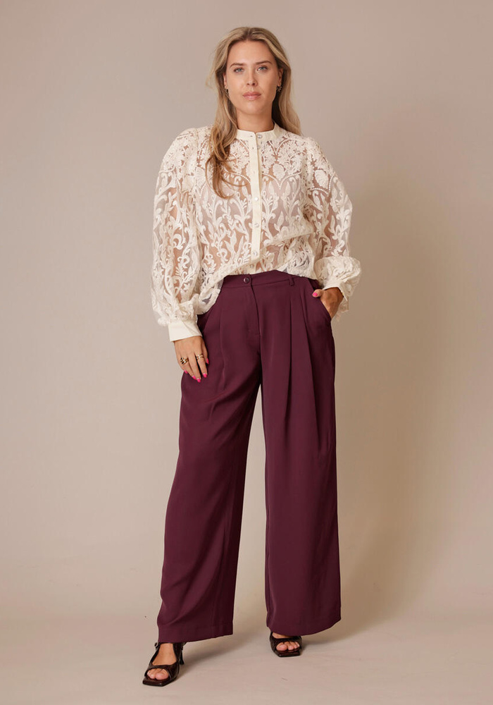 Deze transparante blouse van Summum is van fijn kant en heeft een doorknoopsluiting met fancy parelknoopjes. De blouse heeft een ronde hals en pofmouwen met manchet.
