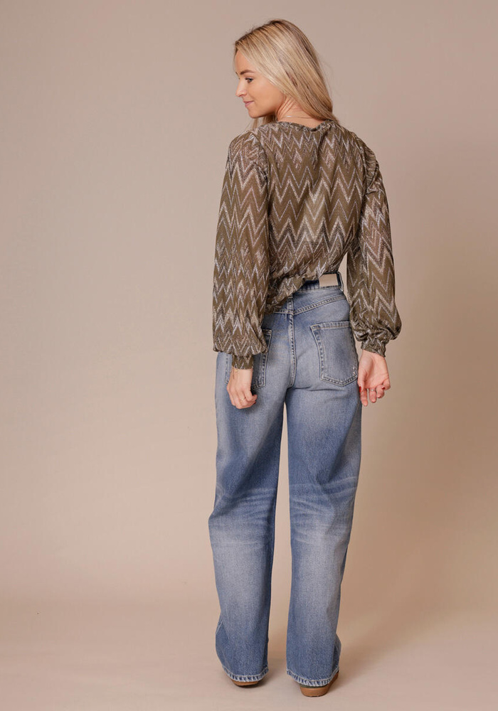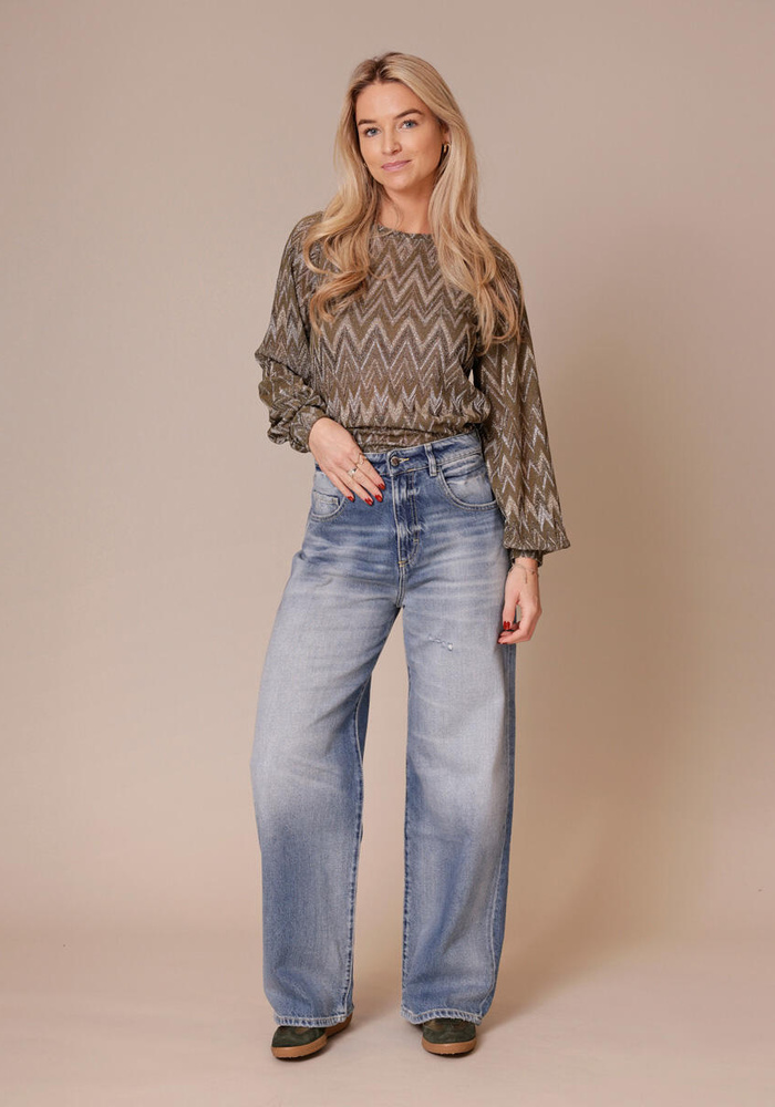 Regular fit top van Italiaanse jacquard met zigzagpatroon en gouden lurex. Met lange pofmouwen, hoge ronde hals en kleuren die de collectie samenbrengen.