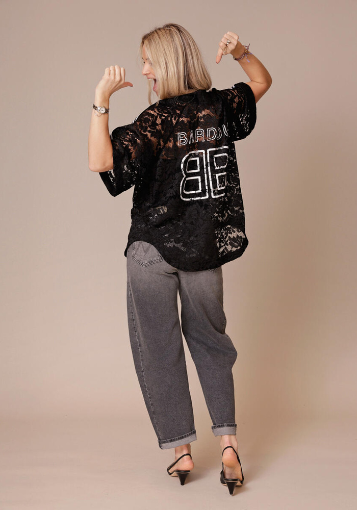 De Brigitte Lace top van Bardou is een echte eyecatcher met zijn elegante kanten stof en speelse transparantie. En hoe leuk de bedrukte achterkant! De losse pasvorm en sportieve strepen op de schouders geven een moderne twist aan dit vrouwelijke ontwerp. Perfect om te dragen over een topje voor een chique avondlook of casual met jeans of sportlegging voor een stoere styling.