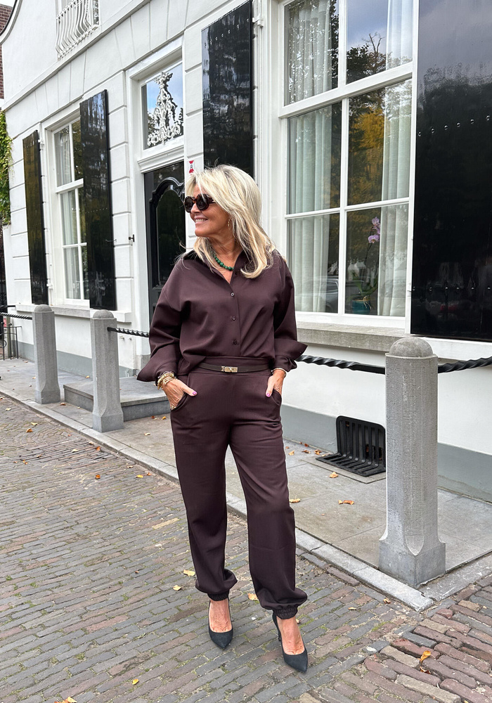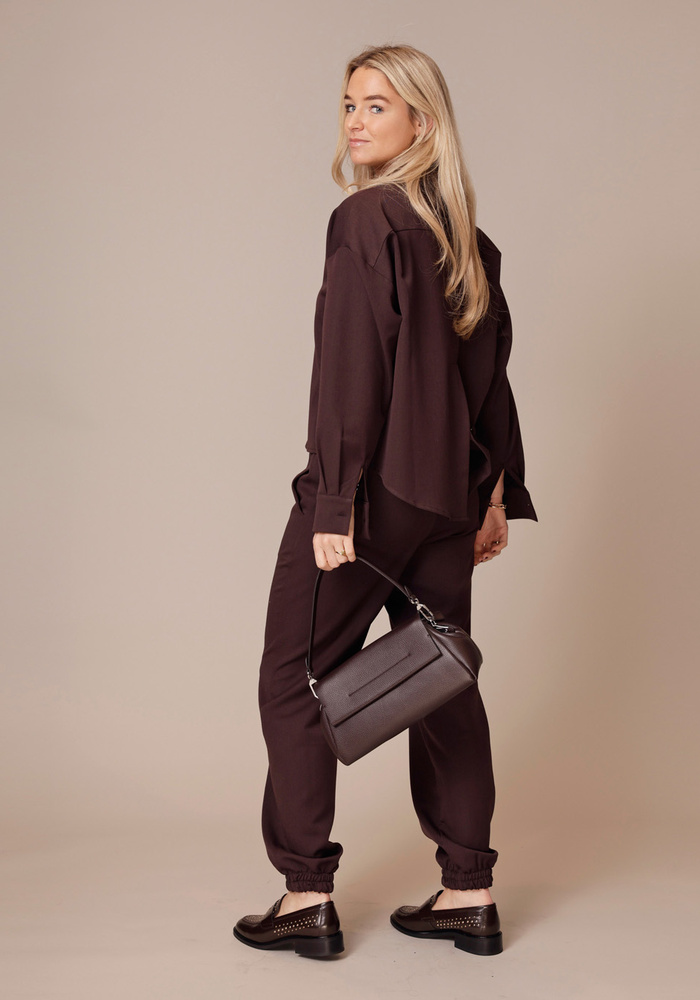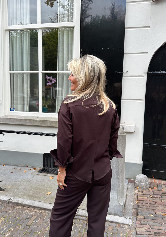 De Silke blouse van Bardou is een stijlvolle essential met een elegante en losse pasvorm. De diepe chocoladetint geeft een chique en moderne uitstraling, terwijl de langere achterkant met split zorgt voor een flatterend silhouet.