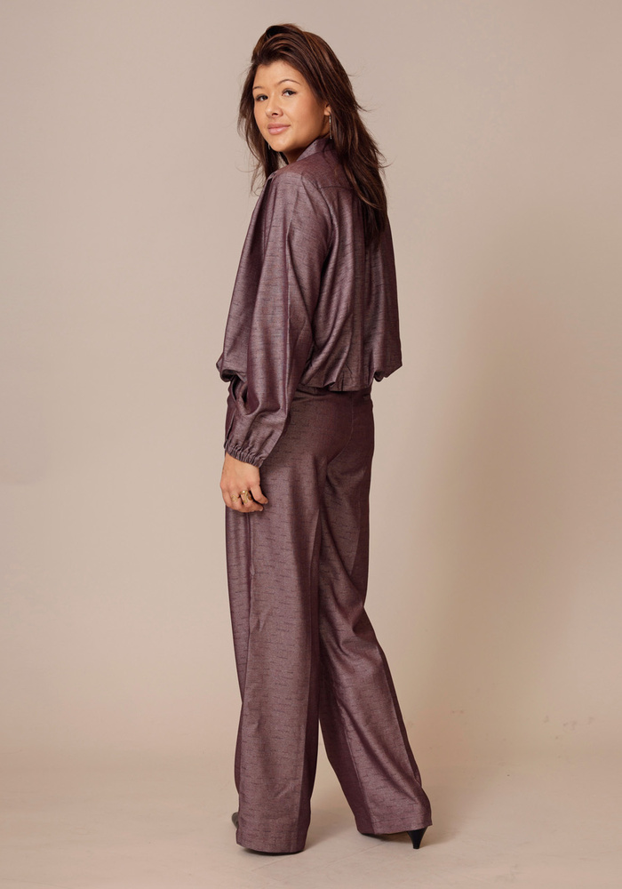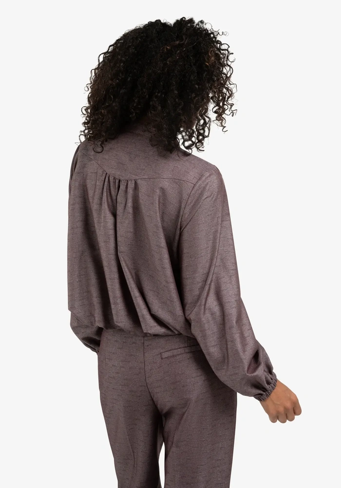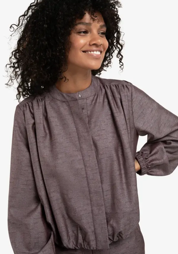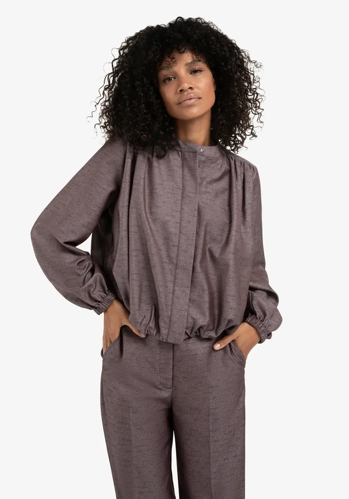 Stijlvolle blousejack met ballonvorm, elastische taille en manchetten. Gemaakt van een zachte, stevige stof met subtiele plooien op de schouders voor een vrouwelijke touch. De blinde knoopsluiting en opstaande kraag zorgen voor een minimalistische, elegante look.