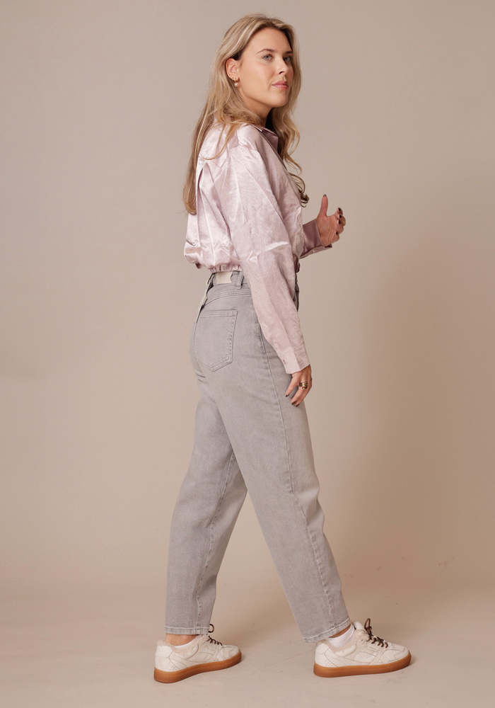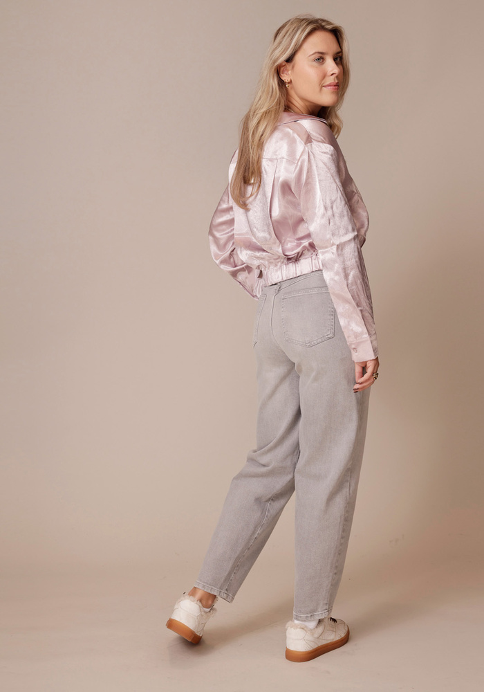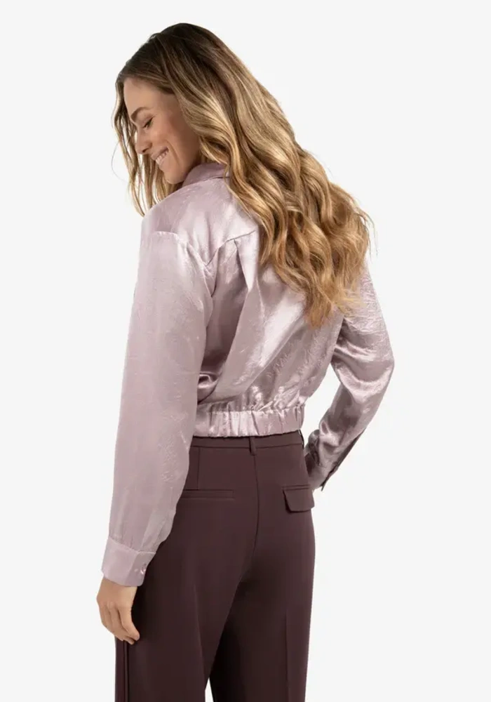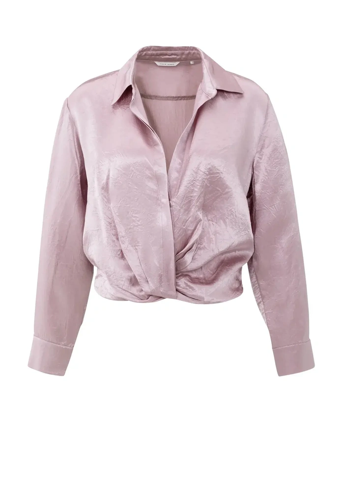 Korte blouse van glanzende satijnlook-stof met elegante drapering aan de voorkant. De elastische taille zorgt voor een blouson-effect en comfortabele pasvorm. Met kraag, lange mouwen en manchetten – een vrouwelijk en modern item dat elke look verfijnt.