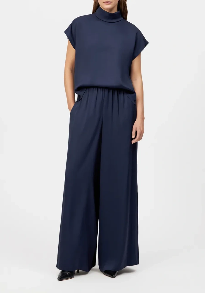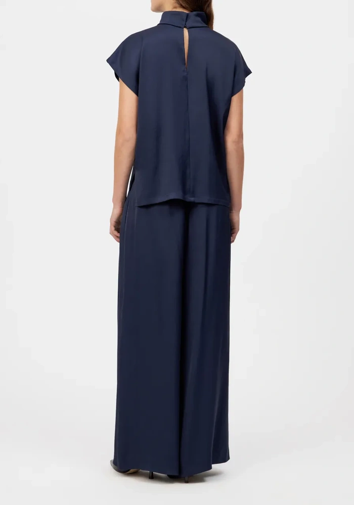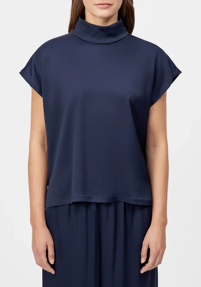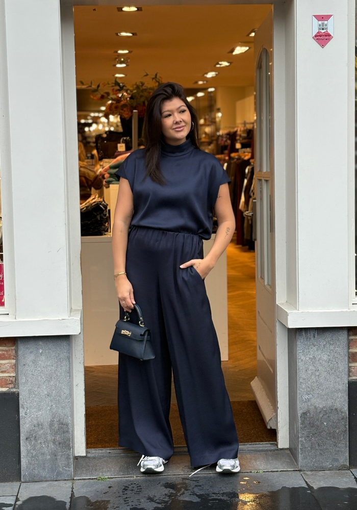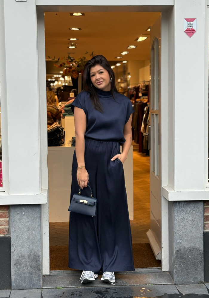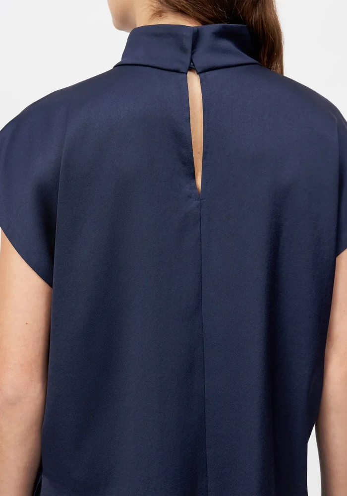 De Alaria top van Drykorn heeft halve mouwen en een opstaande kraag. De kraag kan geopend worden met 2 knoopjes. De achterkant van de top is een stukje verlengd.