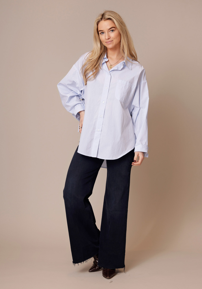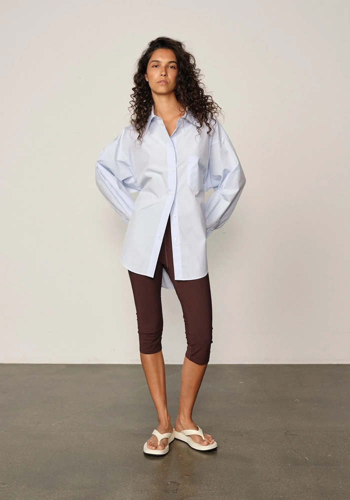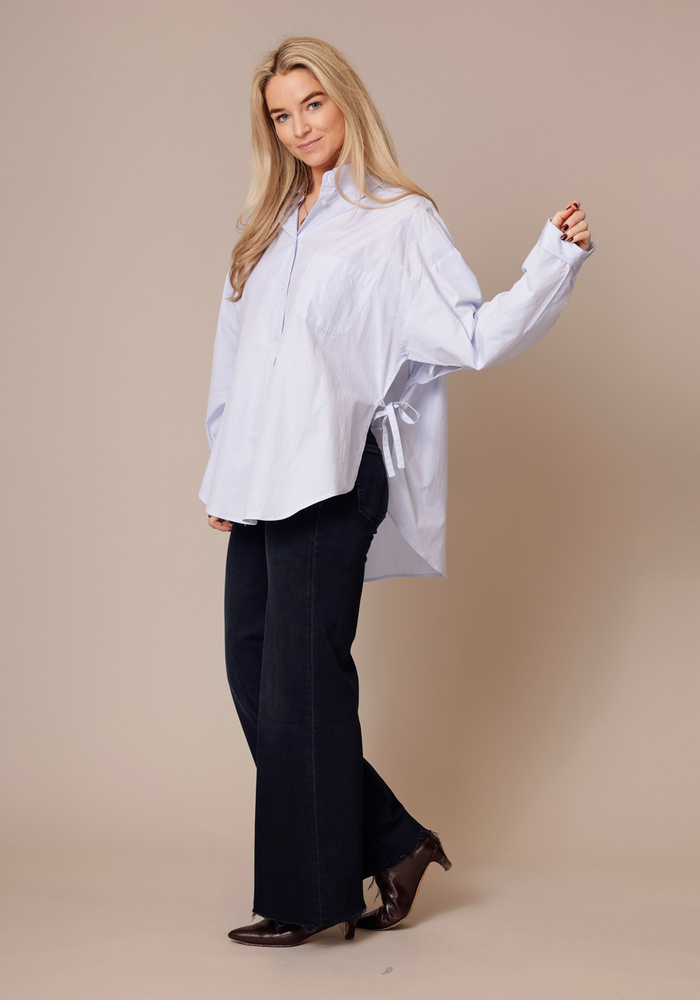 De Jordan shirt van Herskind is voorzien van zijsplitsen en verstelbare achterstrikjes voor veelzijdige styling — aangesnoerd in de taille of los gedragen voor een moeiteloze vorm.