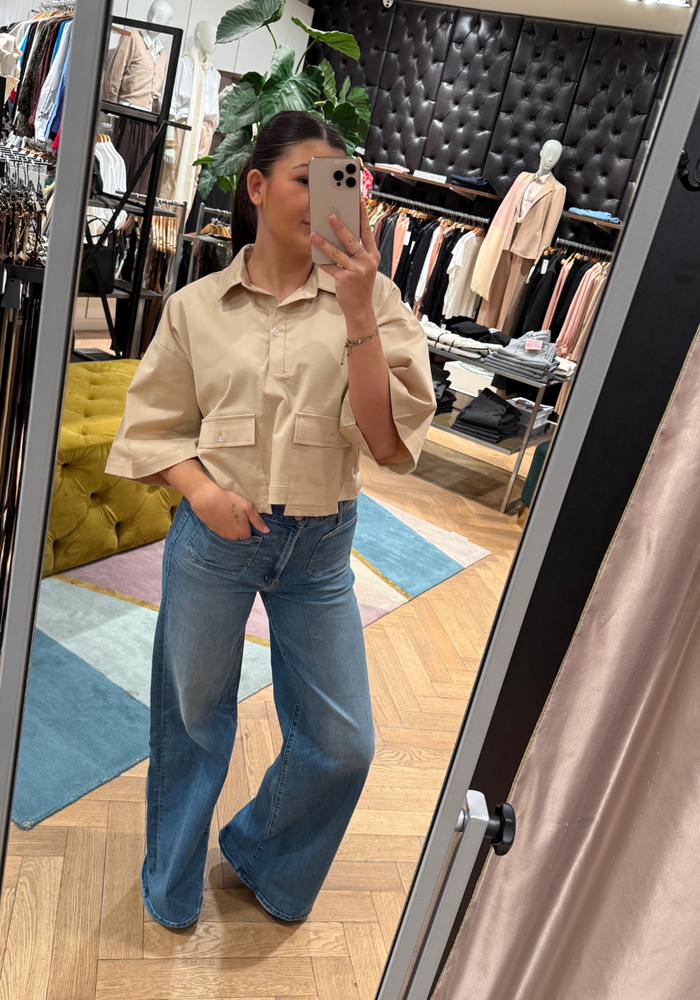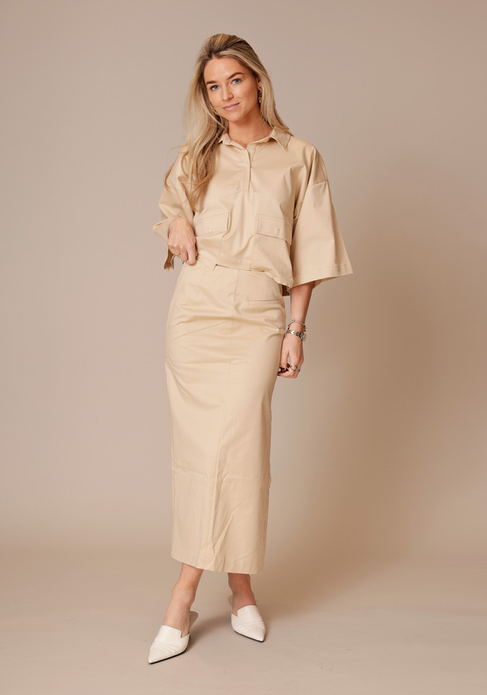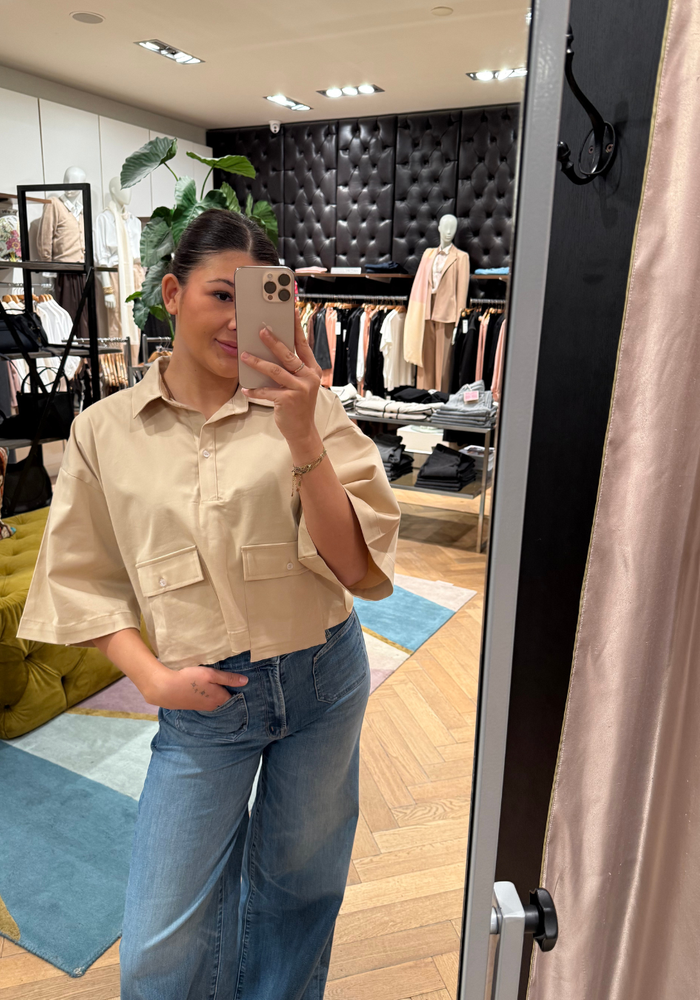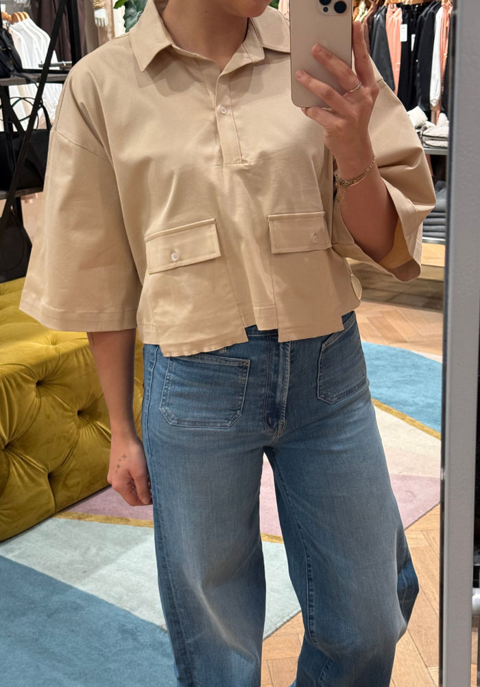 De Nox blouse van March23 is een boxy blouse met een korte pasvorm. De blouse heeft korte mouwen en een knoopsluiting aan de voorzijde.