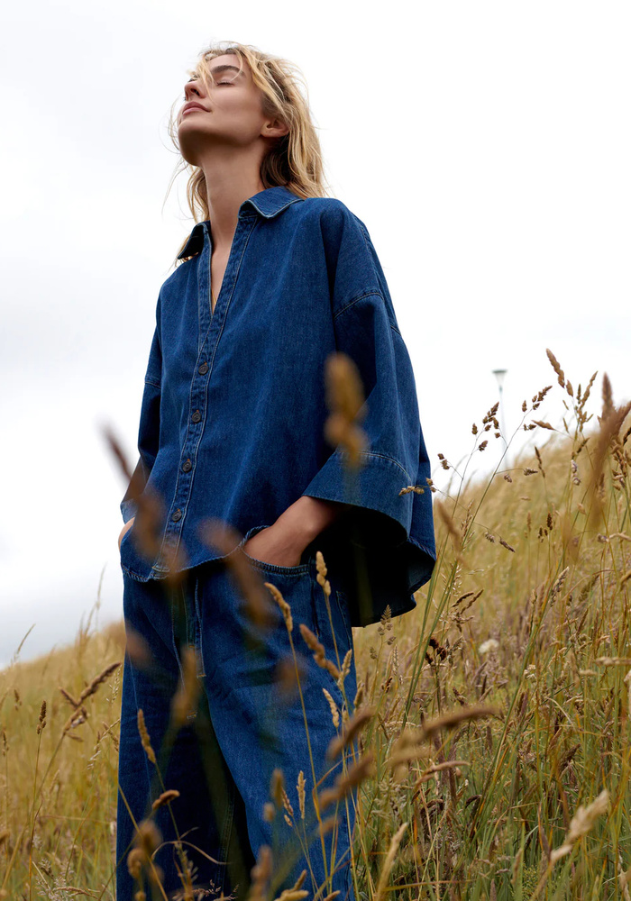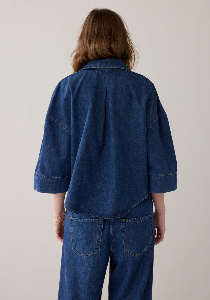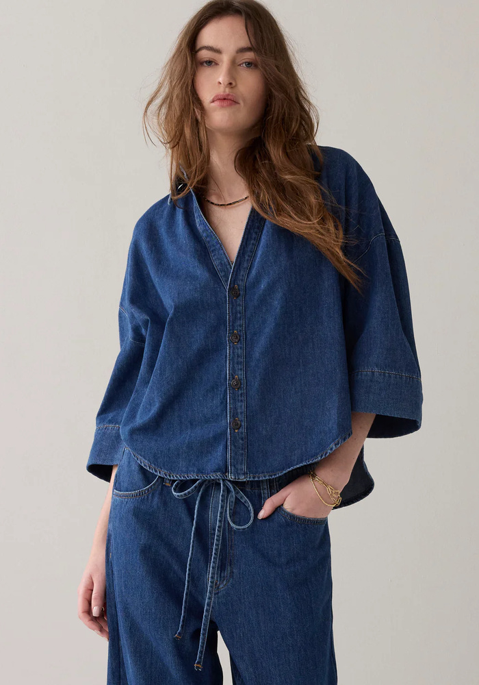De denim kimono blous van Summum is ruimvallende, lichtgewicht denim in dark stonewash. Het model heeft een verlaagde schoudernaad, wijde rechte kimonomouwen en een V-hals met een doorlopende knoopsluiting.