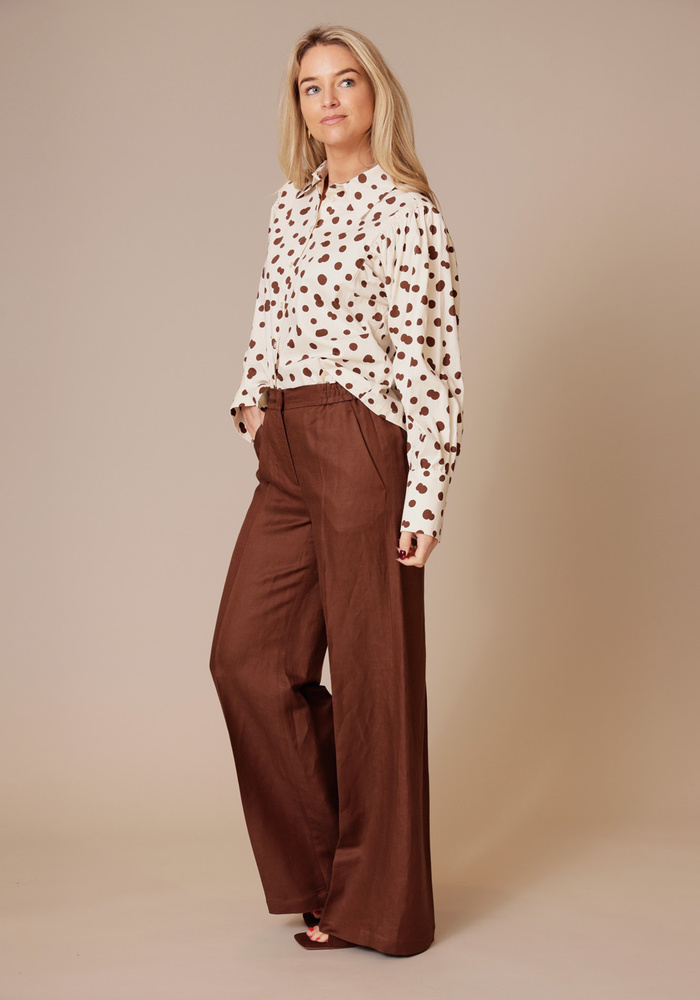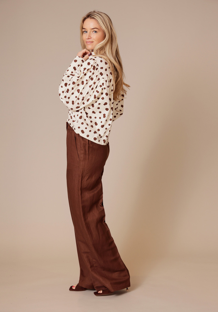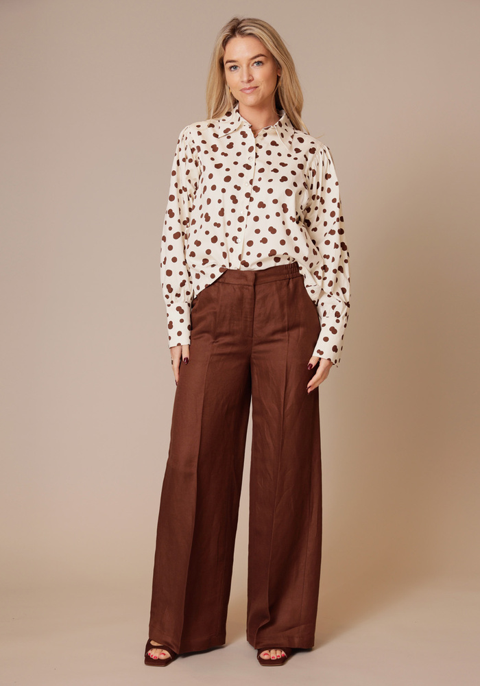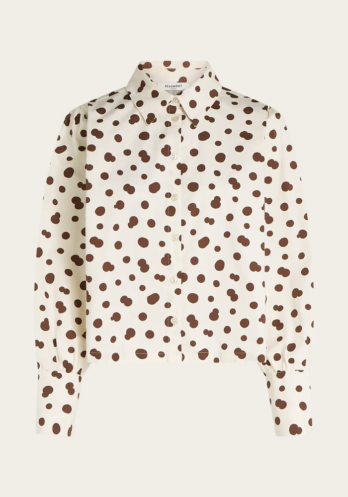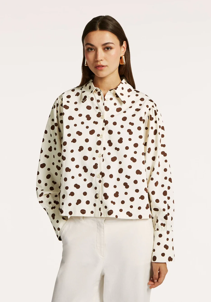 Deze blouse met stippenprint heeft een moderne boxy pasvorm die zorgt voor een comfortabele en eigentijdse uitstraling. De wijde mouwen met subtiele rimpels aan het uiteinde geven het ontwerp een speels en vrouwelijk karakter. Afgewerkt met een kraag en praktische drukknopen is dit een stijlvol item dat gemakkelijk te combineren is.