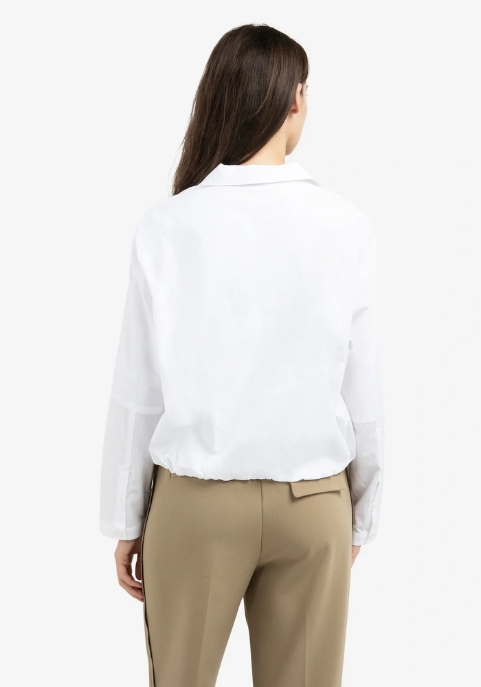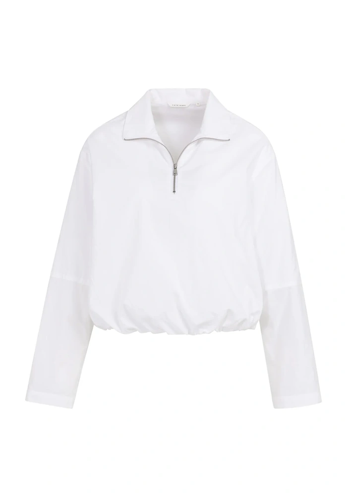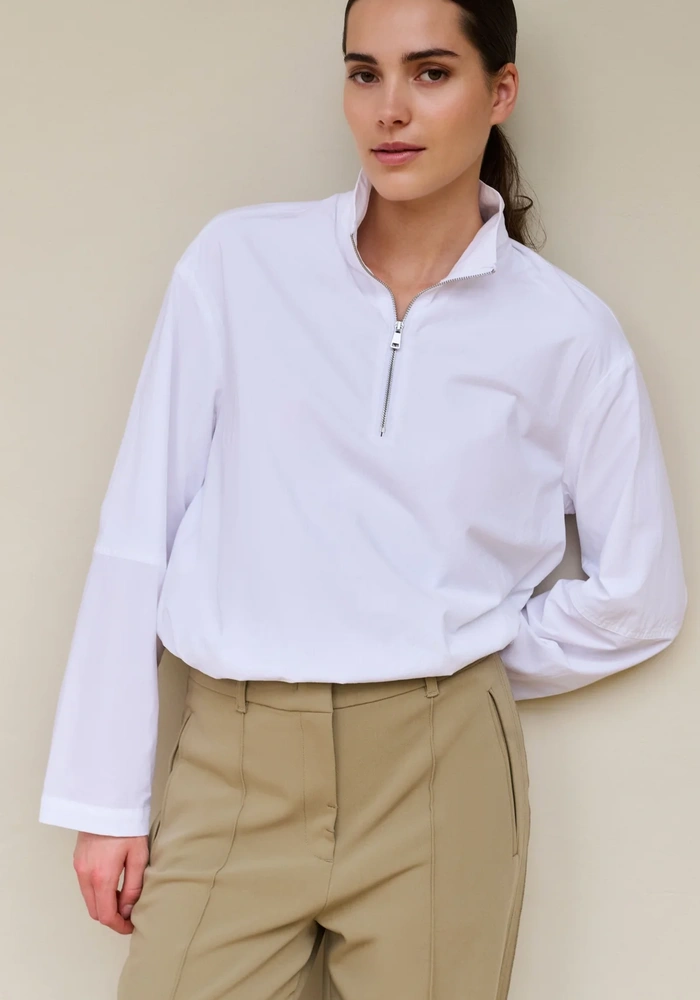 Deze blouse heeft een losse pasvorm met een ballonvormige zoom voor een speels effect. De polokraag en korte ritssluiting geven een sportieve touch, terwijl de lange mouwen met manchetten het geheel afronden. Gemaakt van een luchtige, comfortabele stof, ideaal voor een moderne, casual look.