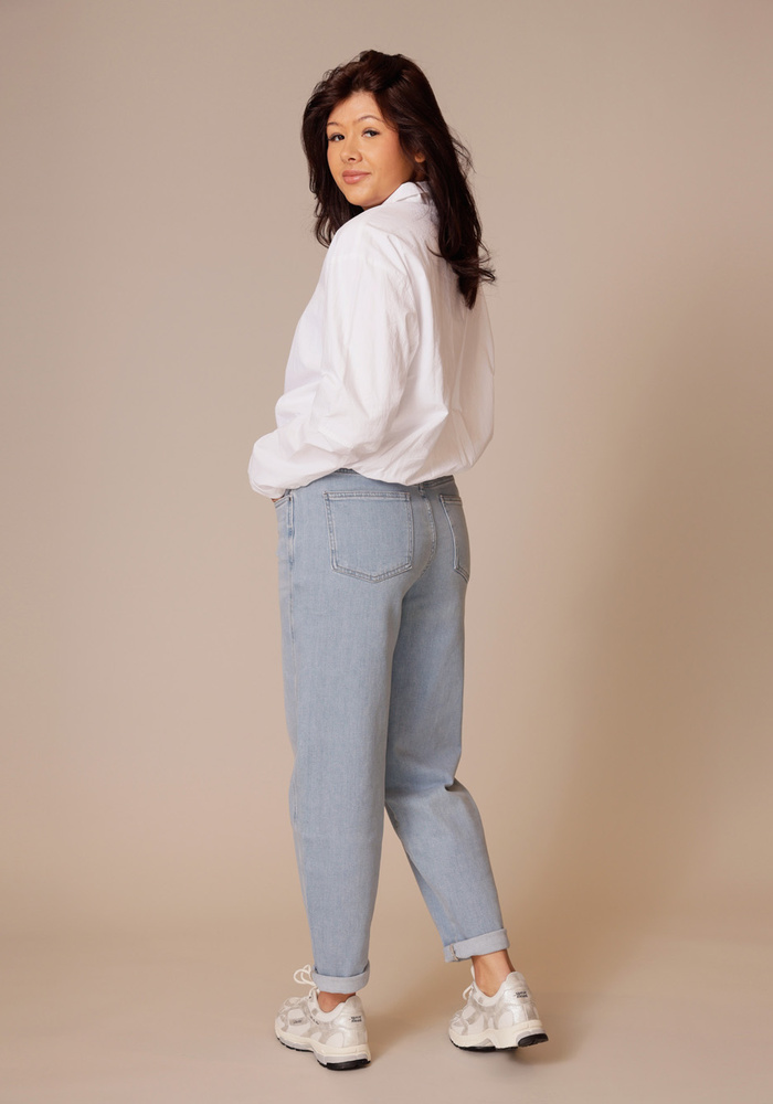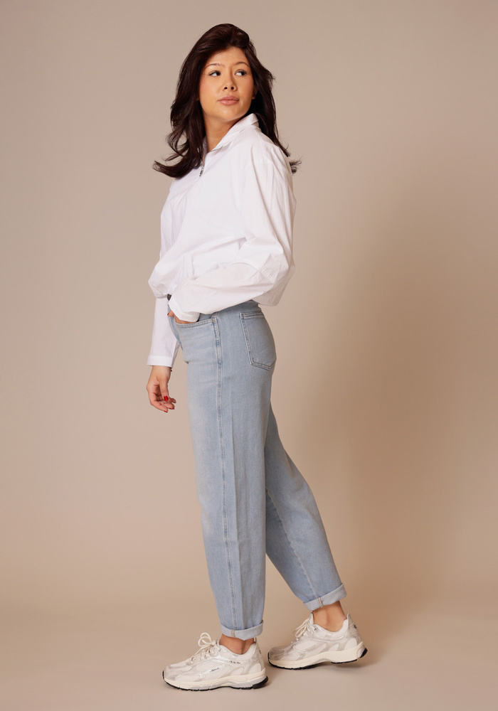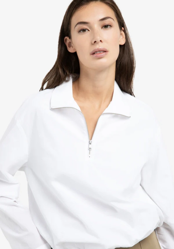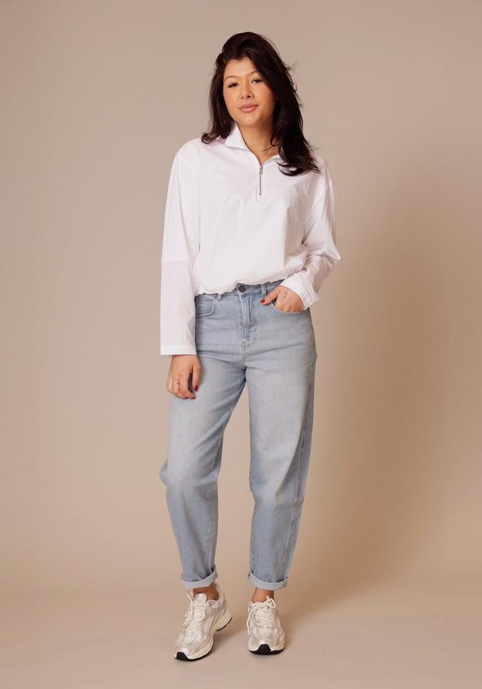 Deze blouse heeft een losse pasvorm met een ballonvormige zoom voor een speels effect. De polokraag en korte ritssluiting geven een sportieve touch, terwijl de lange mouwen met manchetten het geheel afronden. Gemaakt van een luchtige, comfortabele stof, ideaal voor een moderne, casual look.