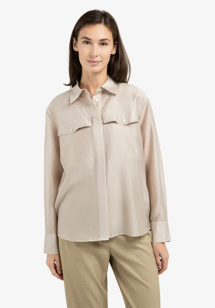 Deze luchtige blouse is gemaakt van transparante stof en heeft een losse, comfortabele pasvorm. Uitgevoerd met een klassieke kraag, lange mouwen met manchetten en twee borstzakken met klep en knoopsluiting. De verborgen knopenrij geeft een verfijnde uitstraling, waardoor dit elegante item ideaal is voor een stijlvolle, gelaagde look.