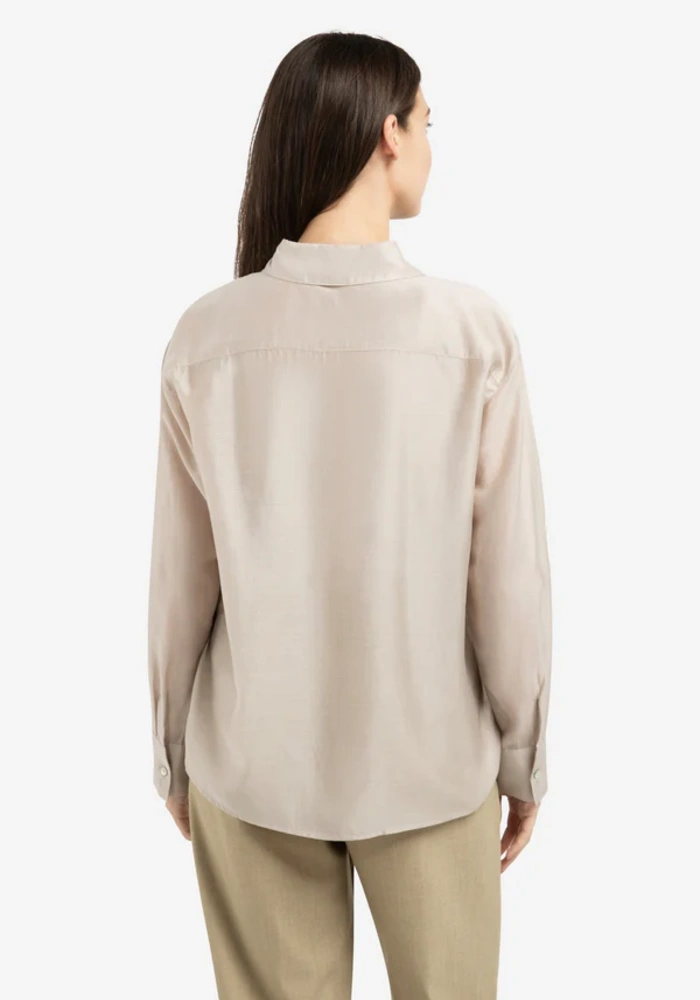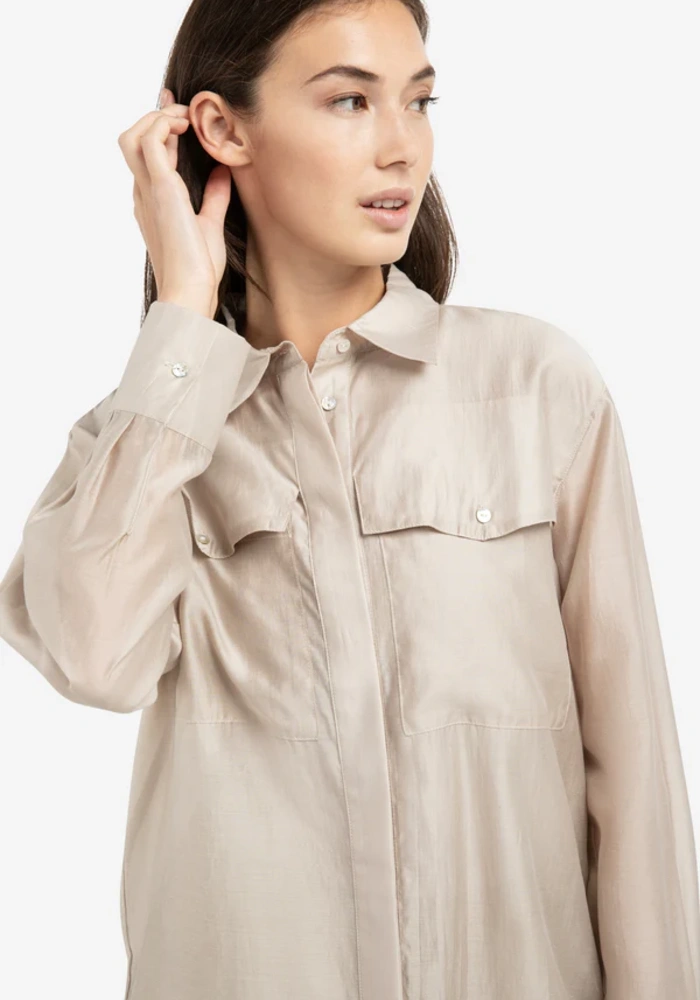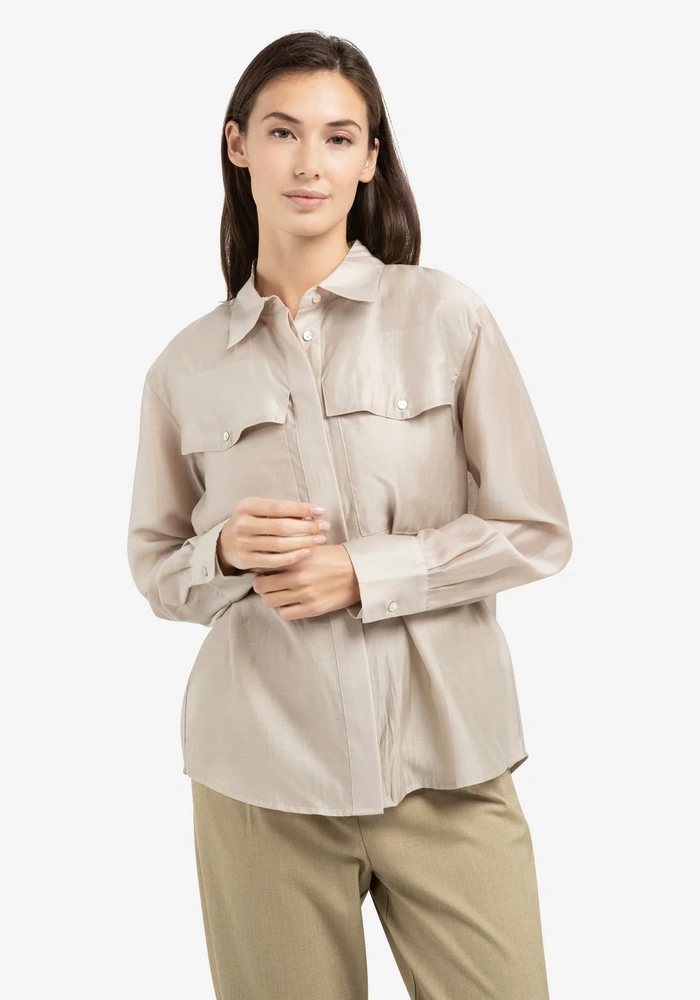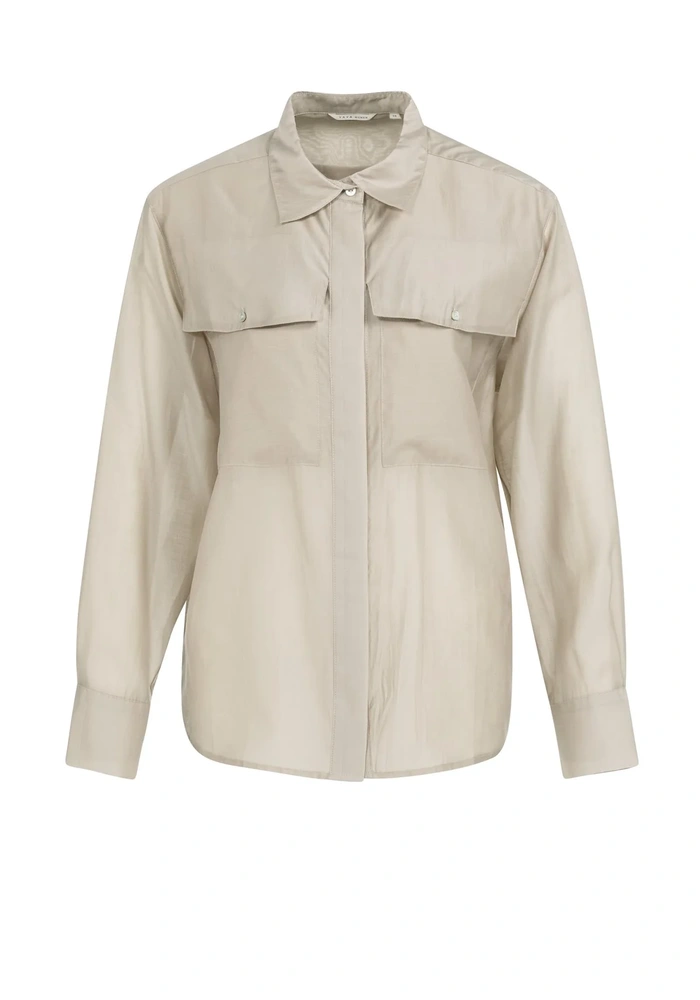 Deze luchtige blouse is gemaakt van transparante stof en heeft een losse, comfortabele pasvorm. Uitgevoerd met een klassieke kraag, lange mouwen met manchetten en twee borstzakken met klep en knoopsluiting. De verborgen knopenrij geeft een verfijnde uitstraling, waardoor dit elegante item ideaal is voor een stijlvolle, gelaagde look.