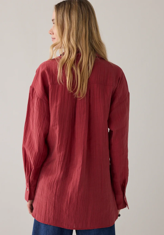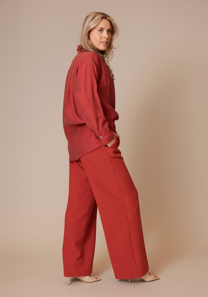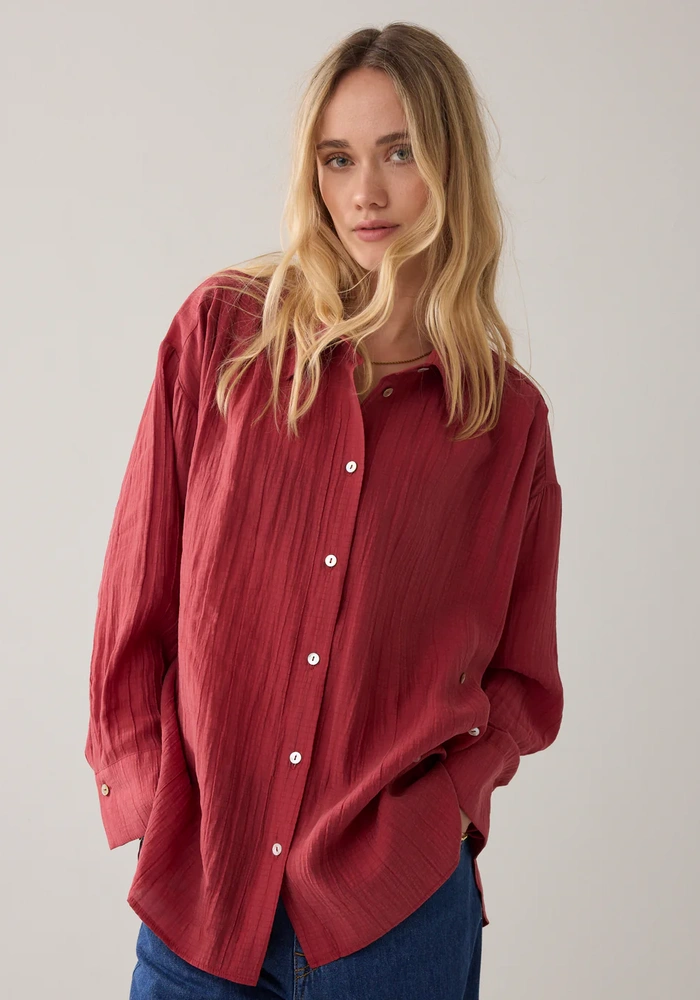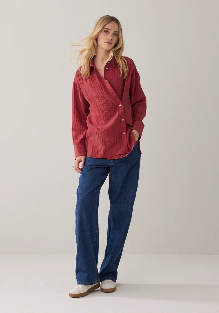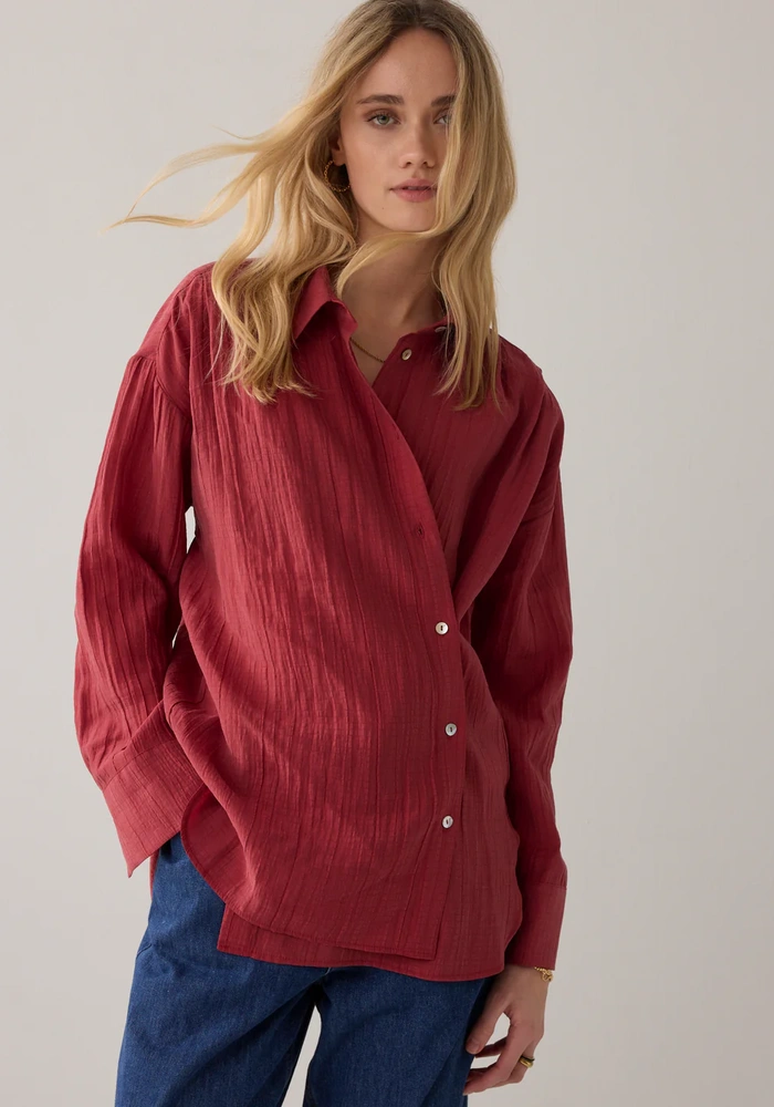 Deze blouse van een zachte lyocellblend is een echt wear-your-way item dankzij de slimme dubbele knoopsluiting. Je kunt hem relaxed dragen met de standaard sluiting, of meer getailleerd door de sluiting naar de zijkant te verplaatsen. De blouse heeft een pas met plooi op de achterkant voor subtiel volume, en de manchetten zijn verstelbaar met een dubbele knoopsluiting, waardoor de pasvorm volledig naar wens kan worden aangepast.