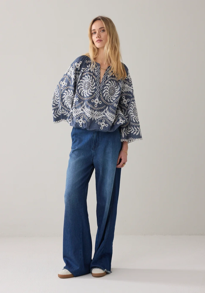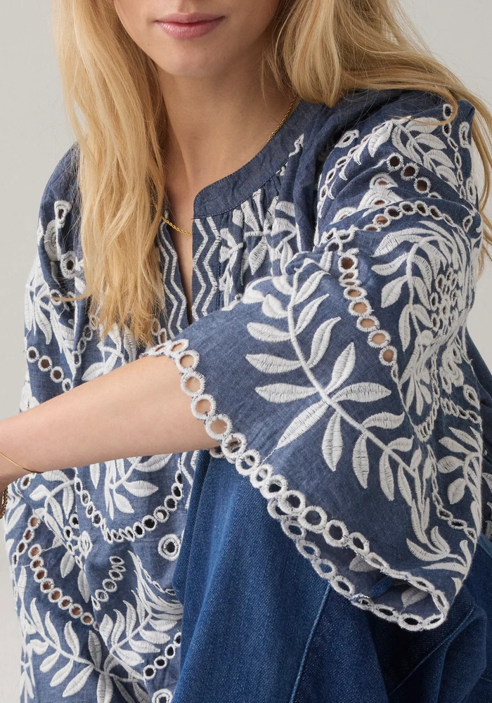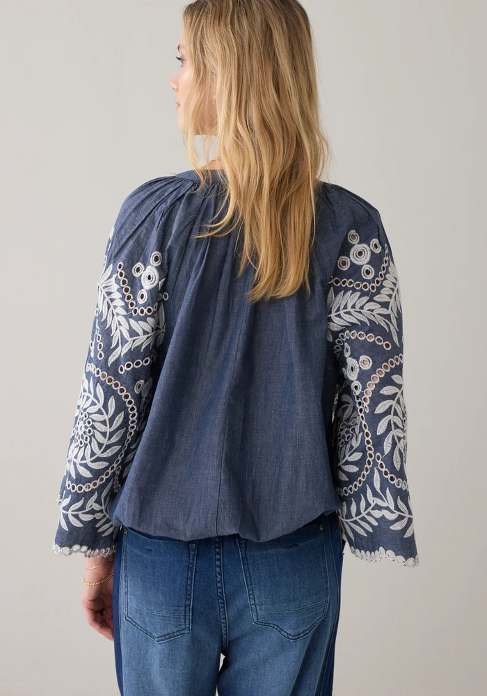 Deze top van zachte chambray is verfijnd afgewerkt met subtiele borduursels en heeft een diepe V-split voor een elegante touch. De trompetmouwen met raglaninzet en de elastische onderkant creëren een speels pofeffect, waardoor de top een luchtige en vrouwelijke uitstraling krijgt.