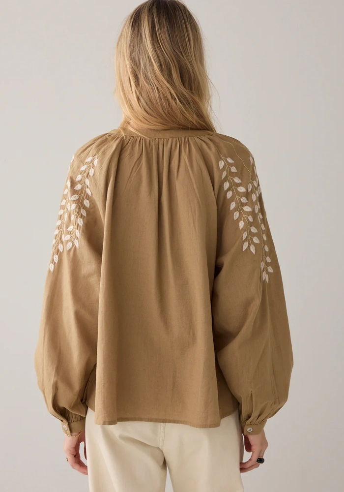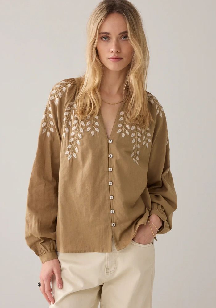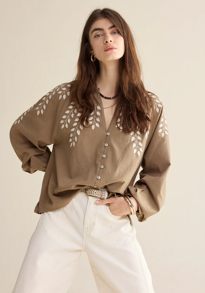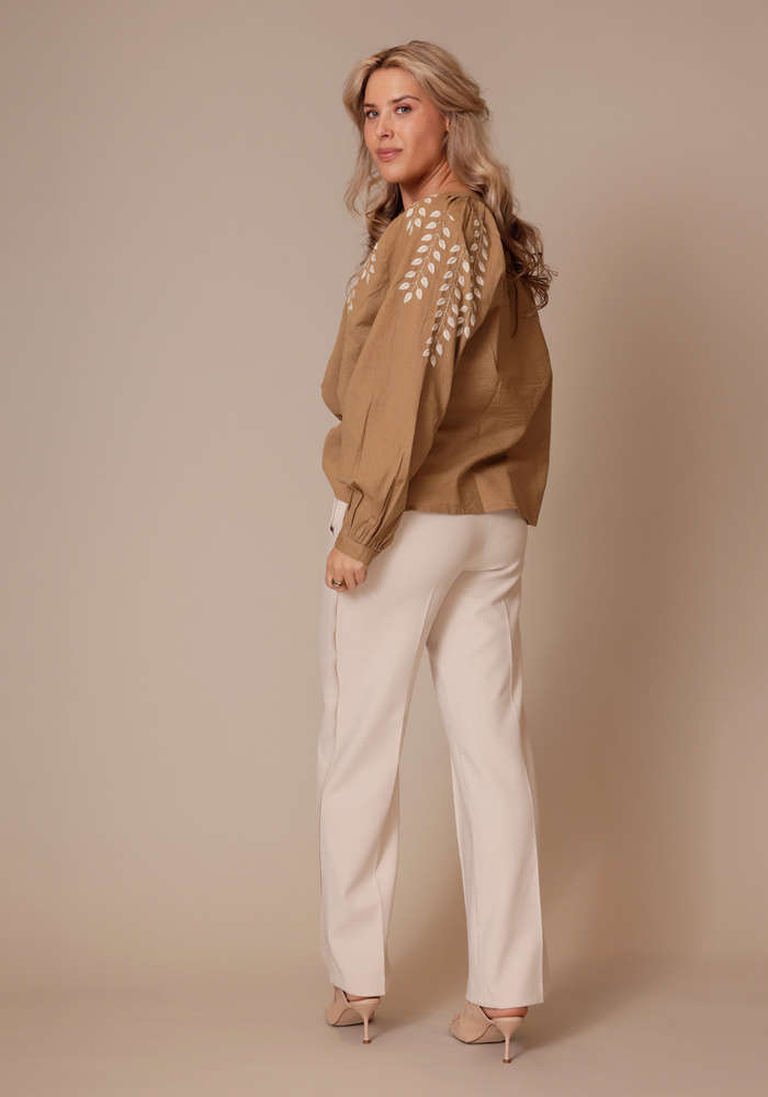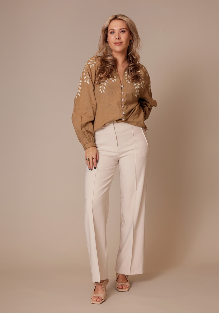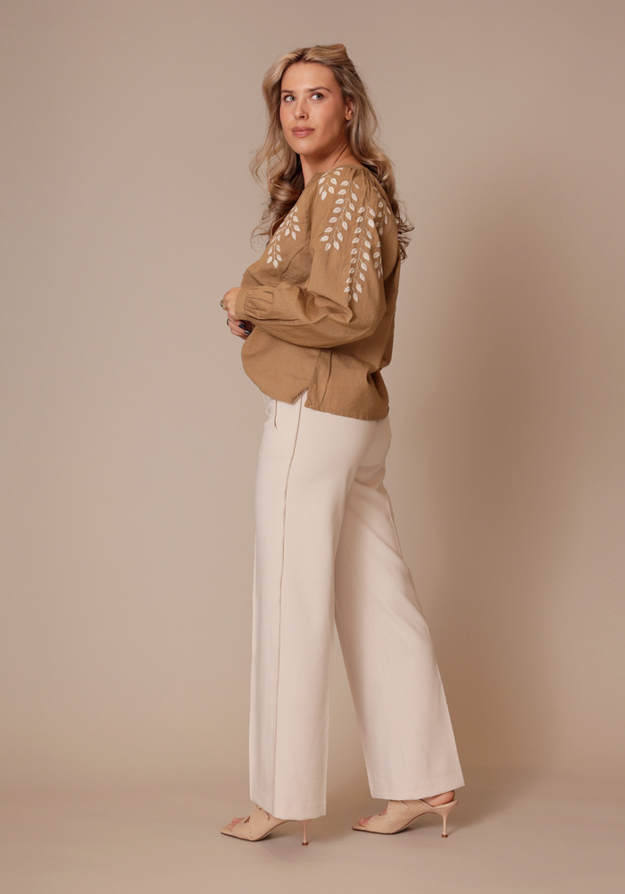 Deze blouse van linnenlook katoen is verfijnd afgewerkt met subtiel borduurwerk en heeft een ruimvallende, comfortabele pasvorm. De knoopsluiting met lusjes en metalen oogjes geeft een charmant detail, terwijl de plooitjes langs de boorden zorgen voor een elegante touch. Het V-split aan de hals maakt het ontwerp luchtig en veelzijdig, perfect voor zowel casual als iets nettere looks.