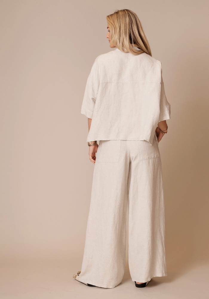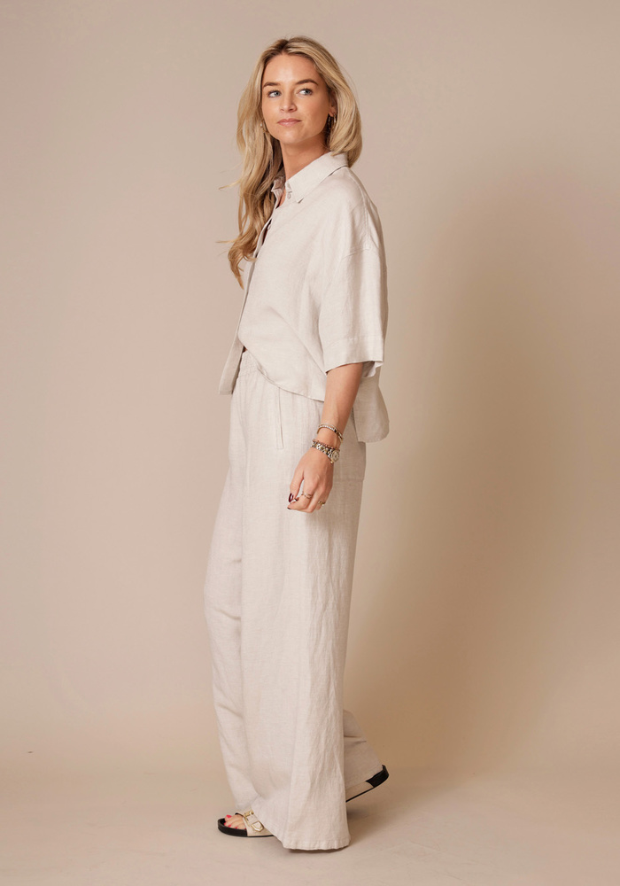 De yarika blouse heeft een wijdvallende, oversized pasvorm met 3/4 mouwen en een klassieke overhemdkraag. De luchtige linnenmix zorgt voor een stevige maar comfortabele kwaliteit met een droge, natuurlijke touch.
