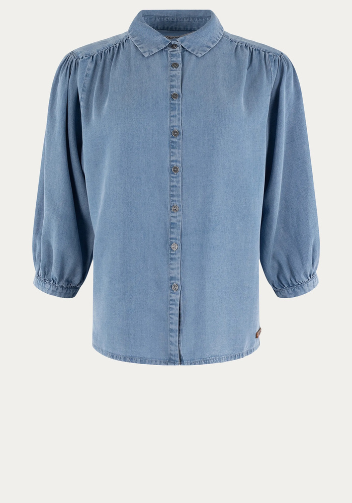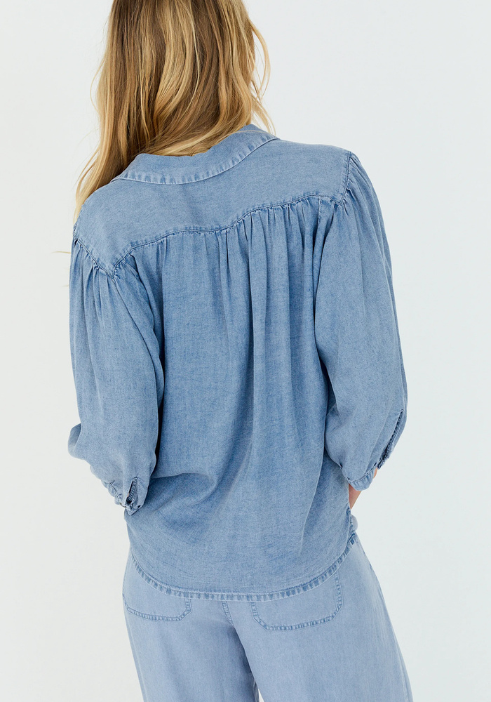 Het anna overhemd in denimikleur is een luchtige en comfortabele zomerse keuze van zacht lyocell. De soepele pasvorm, driekwart pofmouwen en subtiele plooien op de schouders geven het een elegante touch, terwijl de klassieke kraag en knoopsluiting veelzijdig te combineren zijn.