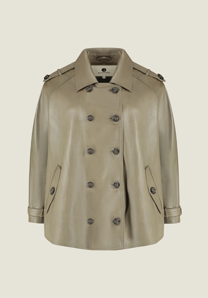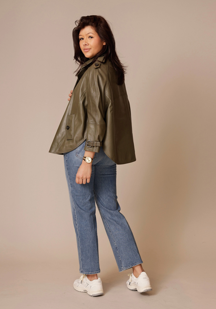Deze poncho-stijl blouse van Madrid schapenleer heeft een stijlvol double-breasted effect. Met schuine steekzakken, bijpassende knopen en verstelbare zijbanden combineert het design moeiteloos functionaliteit met een krachtige, moderne uitstraling