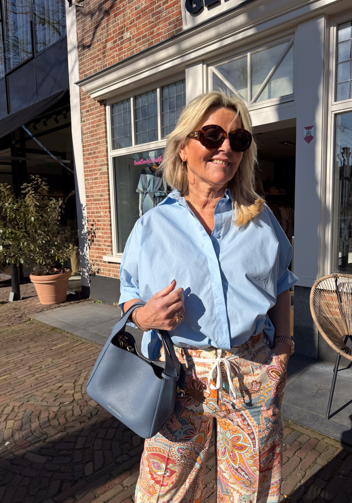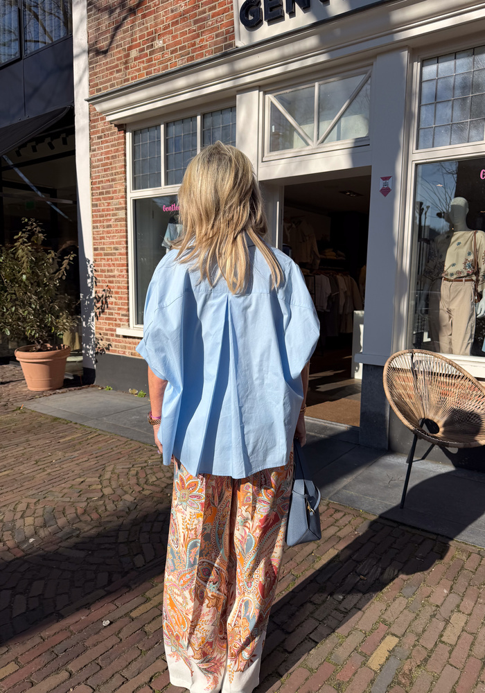 De Bianca blouse van Bardou heeft korte mouwen en is aan de achterkant wat langer. Valt oversized.