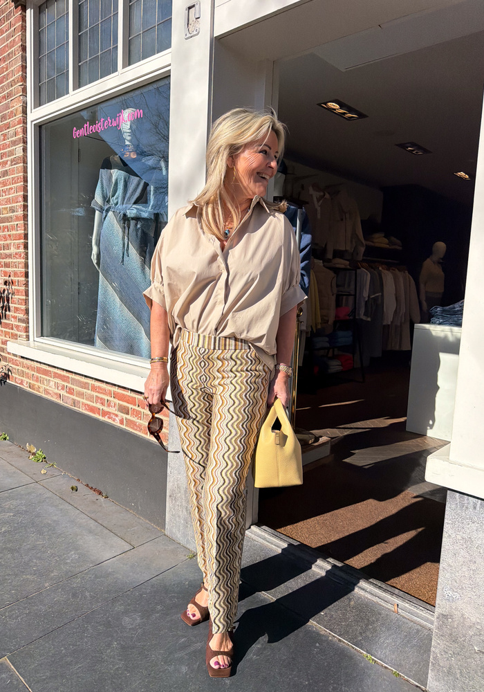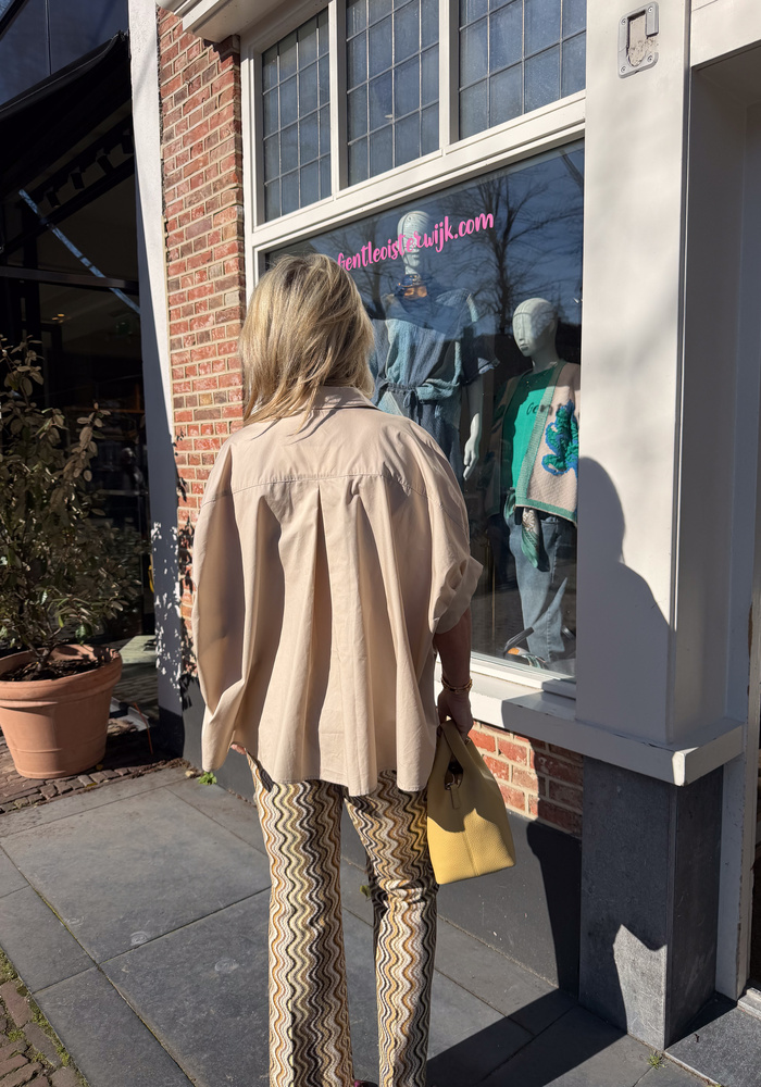 De Bianca blouse van Bardou heeft korte mouwen en is aan de achterkant wat langer. Valt oversized.