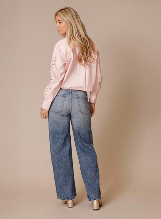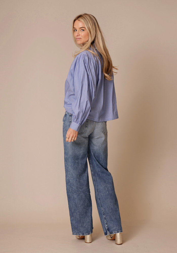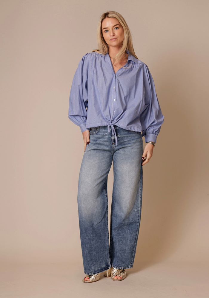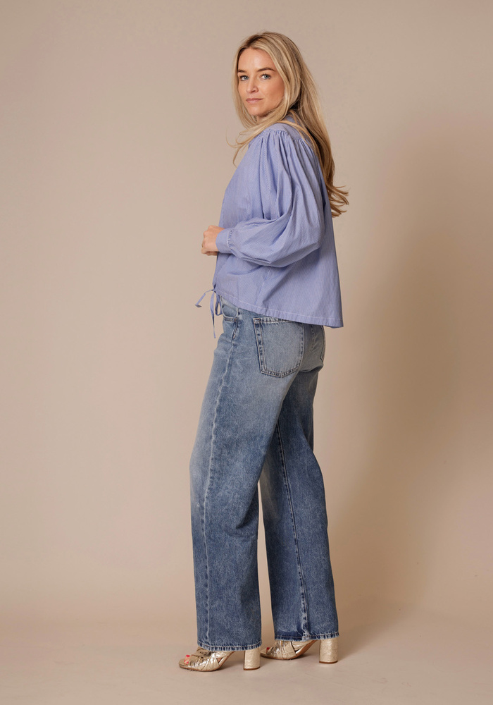 Deze Cordon blouse van Berenice heet lange pofmouwen met v-hals en streepjes. Aan de onderzijde van de blouse zit een koord waardoor je taille kan creëeren.