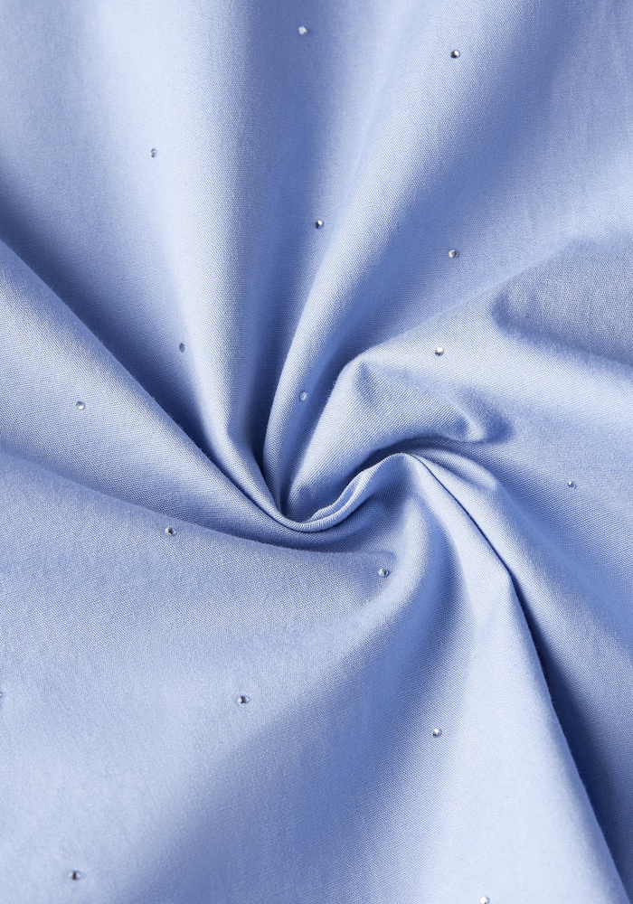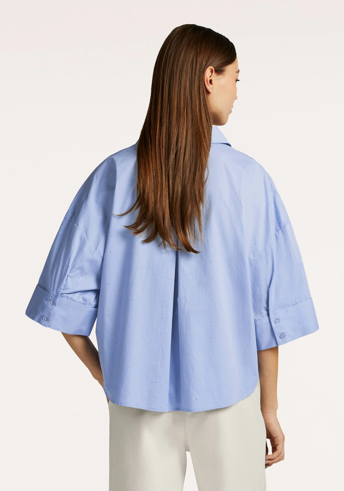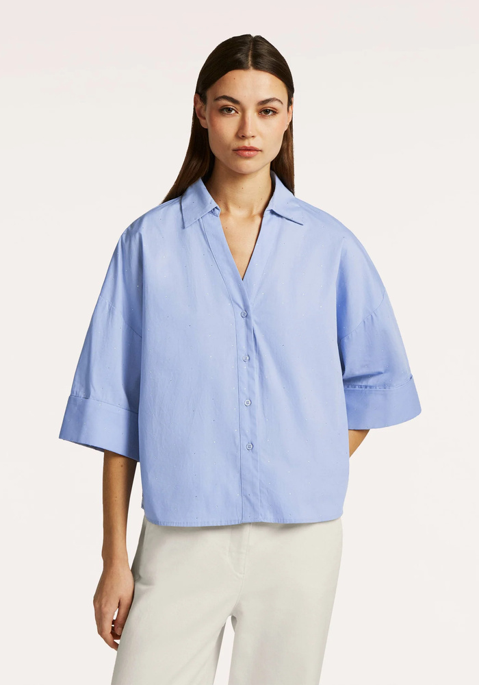 Deze Ezra blouse is uitgevoerd in poplin met all-over rhinestones voor een sprankelende uitstraling en heeft een vrouwelijke A-lijn pasvorm. De 3/4 mouwen met brede manchetten, V-hals met kraag en stijlvolle logoknopen geven het ontwerp een verfijnde en modieuze touch.
