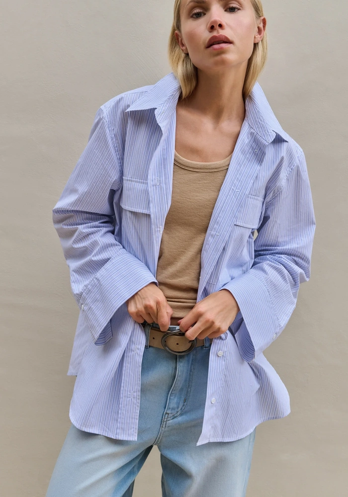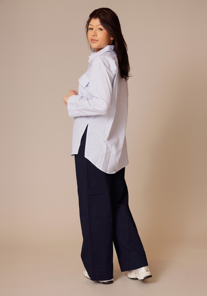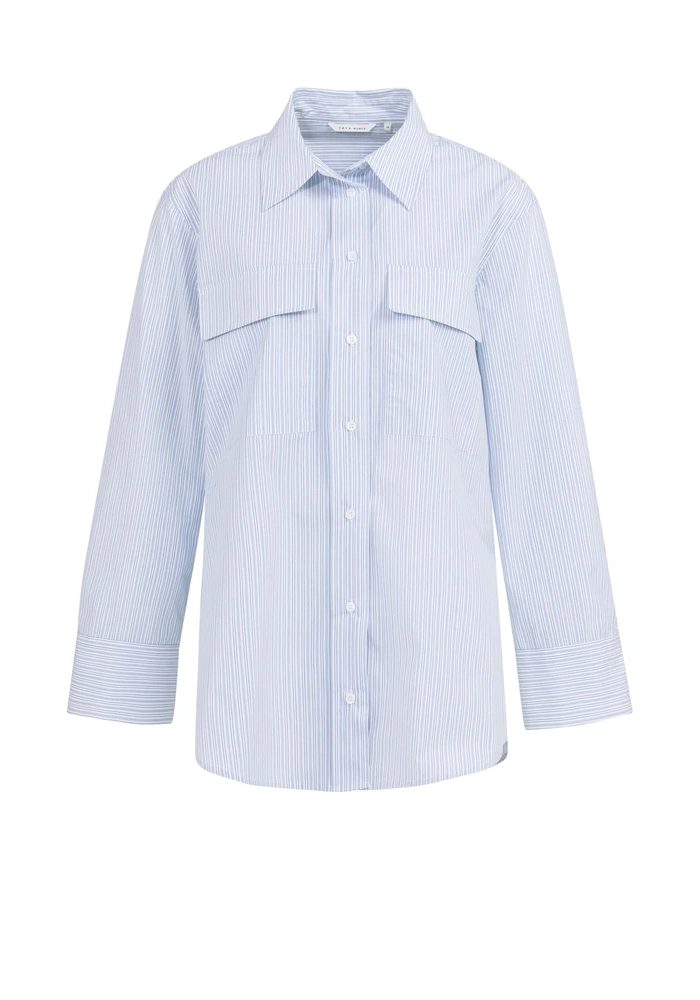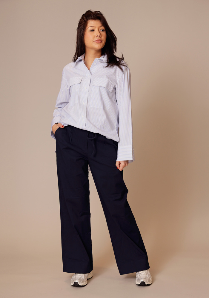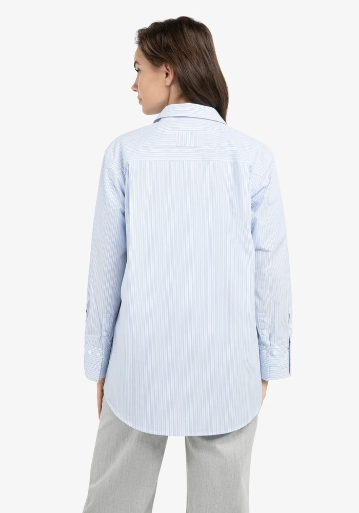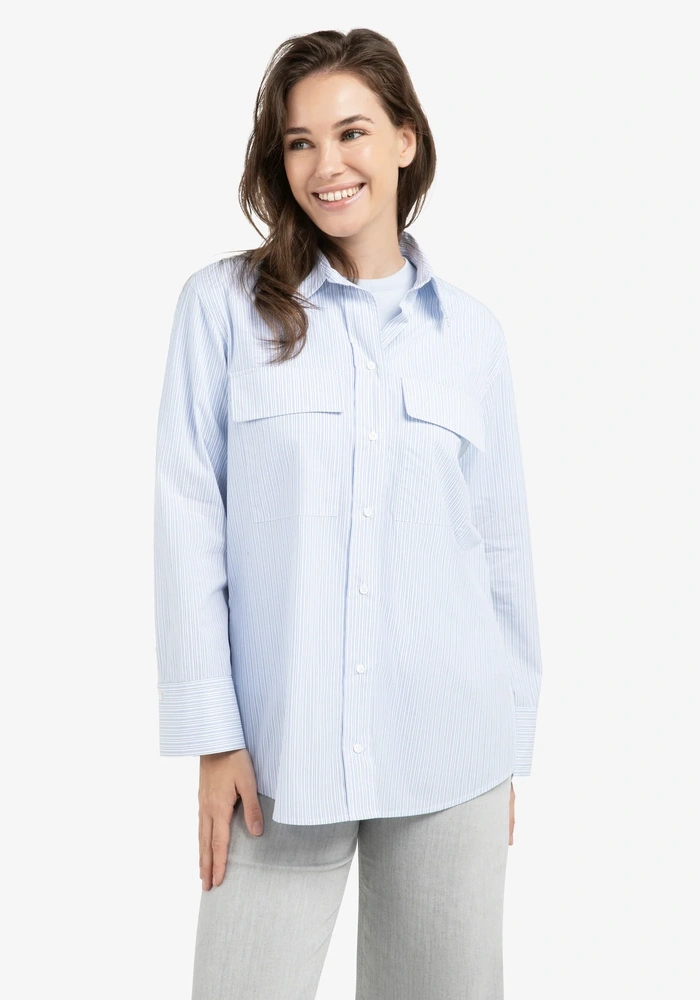 Deze blauwe blouse in boyfriendstijl is gemaakt van een luchtige, zachte stof en heeft een relaxte, losse pasvorm. De klassieke kraag, doorknoopsluiting en borstzakken met klep geven een tijdloze uitstraling. Brede manchetten met dubbele knoopsluiting voegen een stijlvol detail toe. Een veelzijdig item voor een elegante, moeiteloze look.
