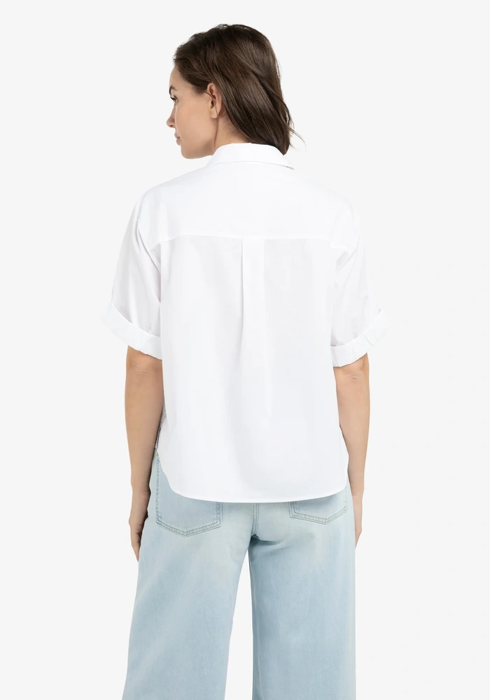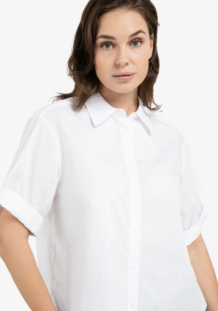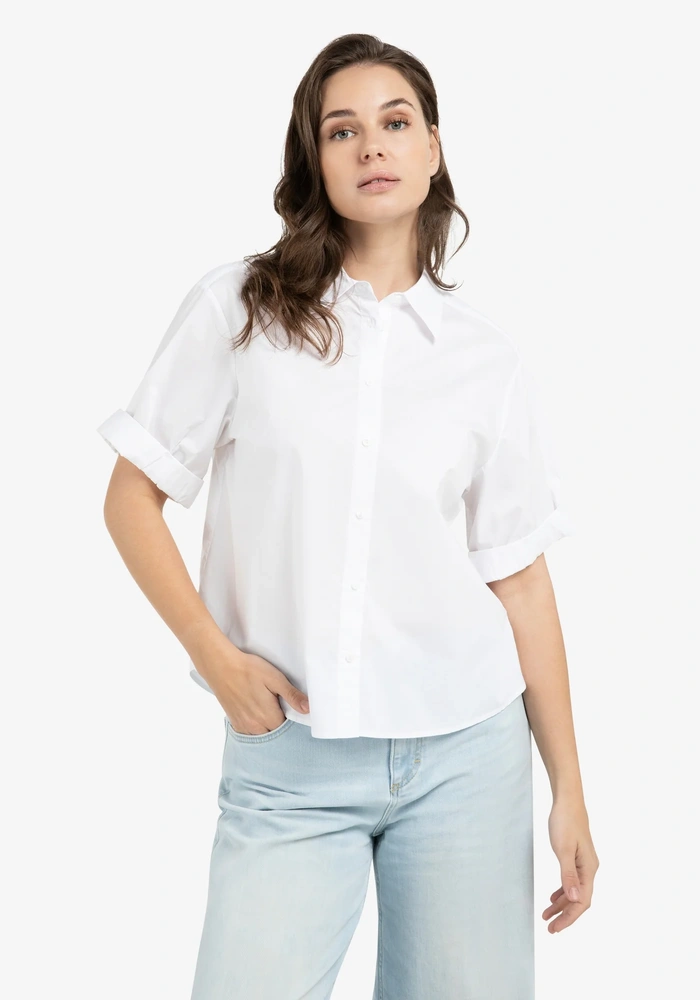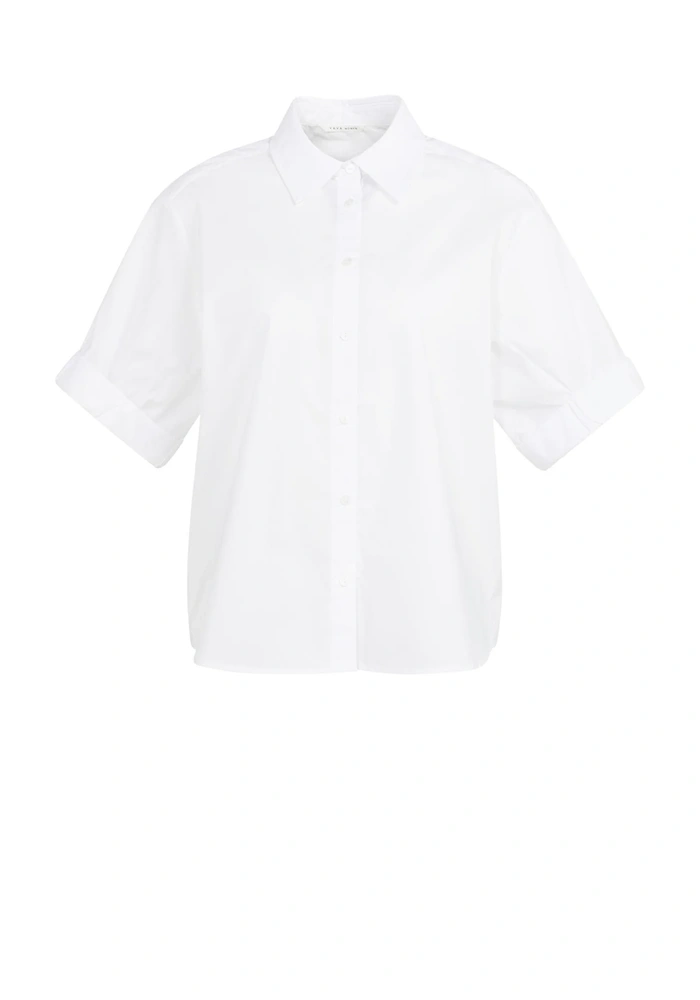 Deze frisse witte blouse is gemaakt van katoen en heeft korte mouwen met een subtiel omgeslagen detail. De klassieke kraag en de losse pasvorm zorgen voor een tijdloze uitstraling. Met een heuplengte en een knoopsluiting aan de voorkant is deze blouse ideaal te stylen voor zowel een casual als een meer geklede look.