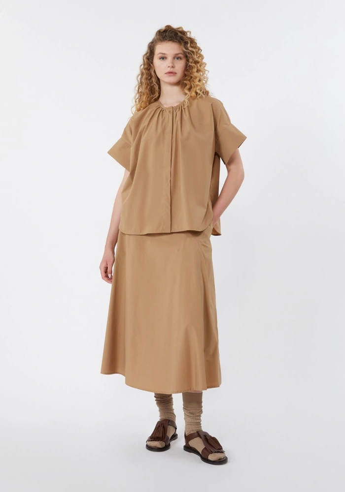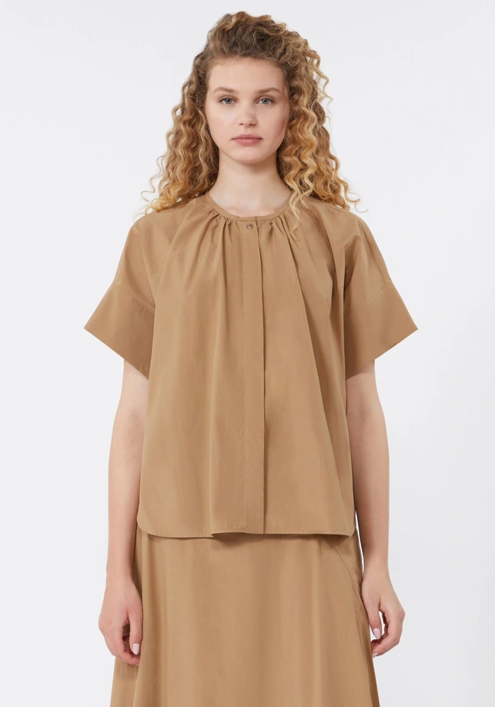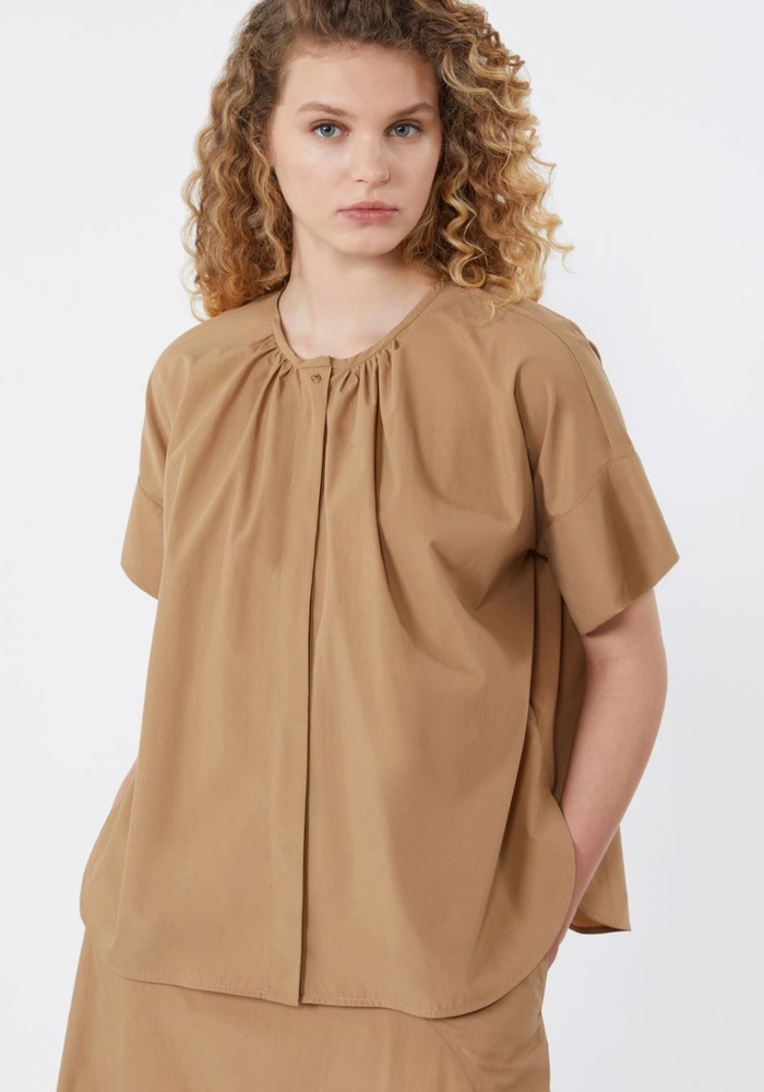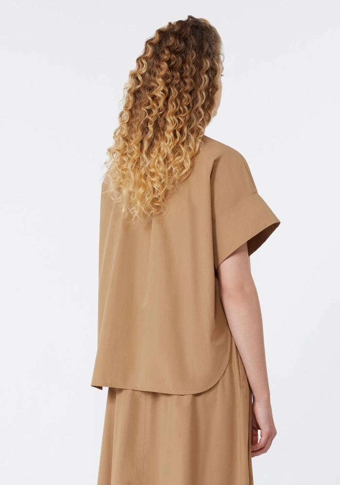 De Wkdeducata van Weekend Marmara is een oversized overhemd van puur katoenen poplin combineert comfort met een verfijnde uitstraling. Het gerimpelde detail bij de hals, zowel voor als achter, geeft het ontwerp een subtiele, stijlvolle touch. De ronde hals, korte kapmouwen en verborgen sluiting met zichtbare bovenste knoop zorgen voor een moderne look