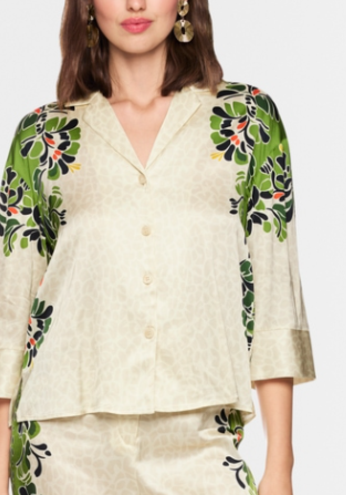 Marccain blouse in soepelvallende viscose heeft een trendy pyjamastijl met halflange, wijd gesneden mouwen. De combinatie van subtiel luipaardpatroon en gestileerde hibiscusbloemen geeft de blouse een modieus en elegant karakter.