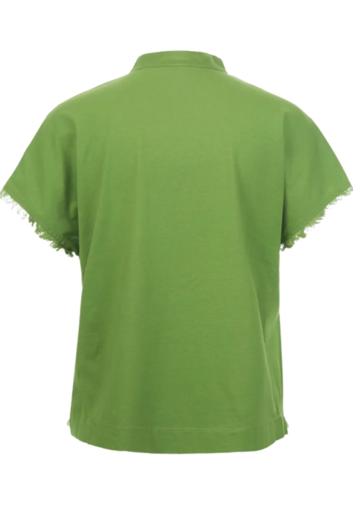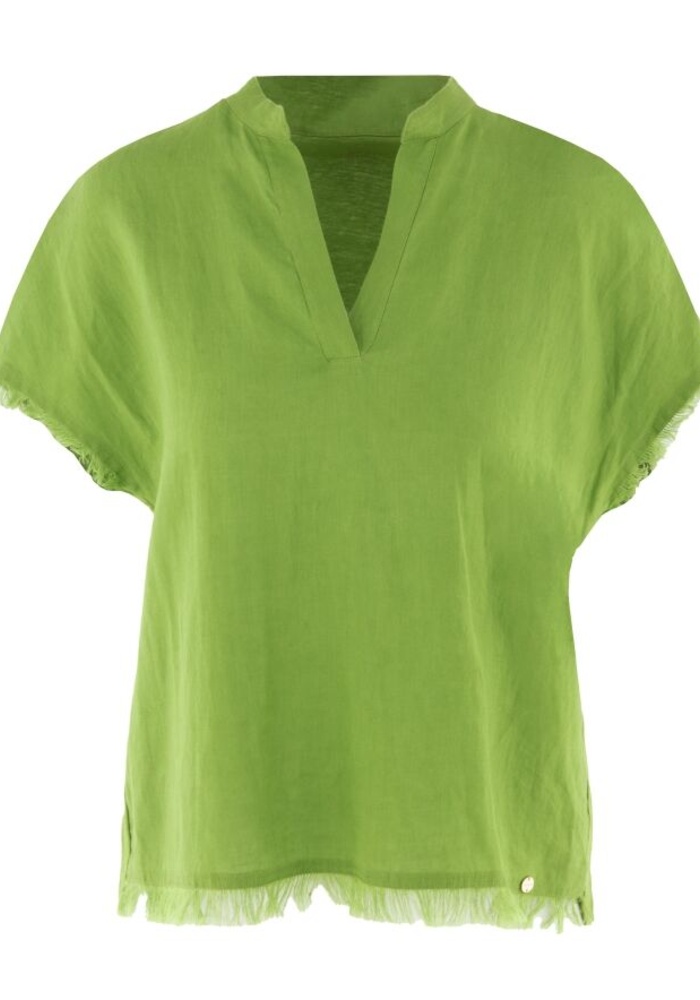 Dit luchtig gesneden blouseshirt van Marccain combineert een moderne materiaalmix: linnen aan de voorkant en zacht katoen aan de achterkant. De subtiele V-hals met fijne bies langs de kraag geeft een elegante uitstraling. Korte, aangeknipte mouwen en speelse franjes aan de mouwuiteinden en zoom maken de look zomers, nonchalant en stijlvol.
