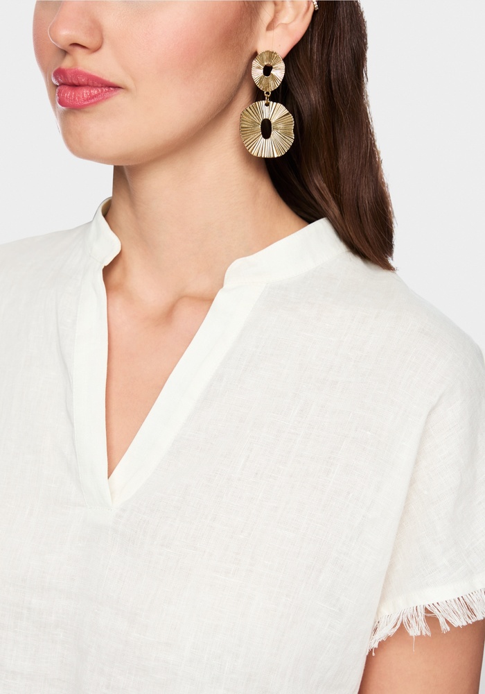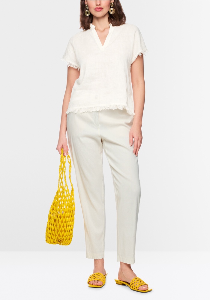 Dit luchtig gesneden blouseshirt van Marccain combineert een moderne materiaalmix: linnen aan de voorkant en zacht katoen aan de achterkant. De subtiele V-hals met fijne bies langs de kraag geeft een elegante uitstraling. Korte, aangeknipte mouwen en speelse franjes aan de mouwuiteinden en zoom maken de look zomers, nonchalant en stijlvol.