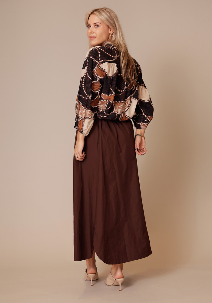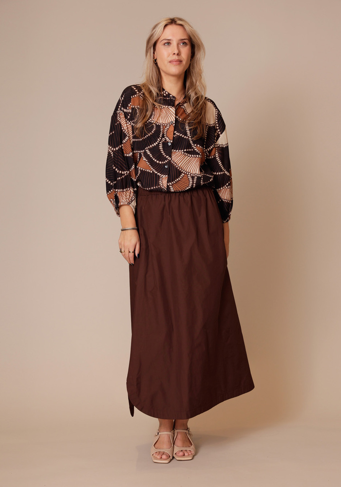 De grafische print in warme tinten en de soepelvallende stof zorgen voor een elegante beweging. De licht oversized fit,