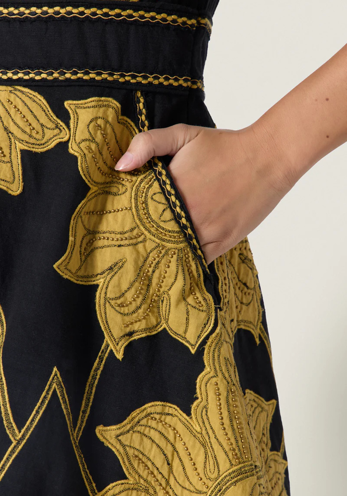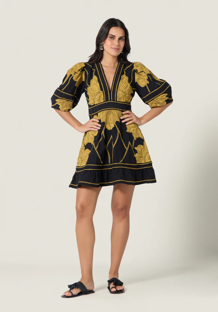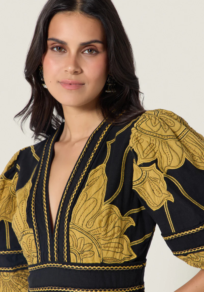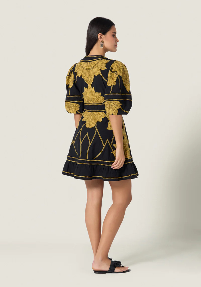 Scarlett Poppies Petal Whispers Dress is een vrouwelijke fit-and-flare jurk met pofmouwen en een getrapte zoom. De katoenen stof met bloemapplicaties en gouden details geeft de jurk een elegante, verfijnde look.