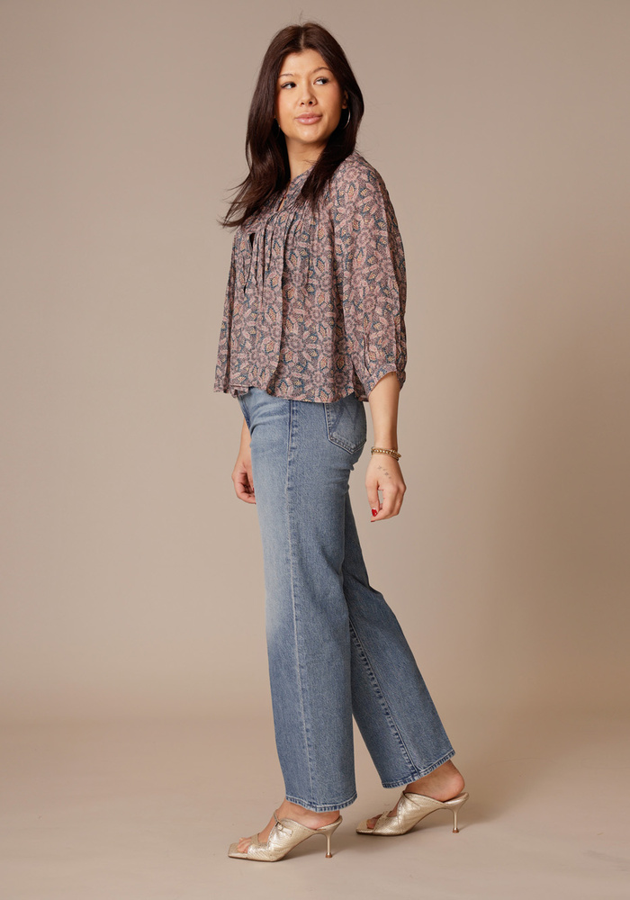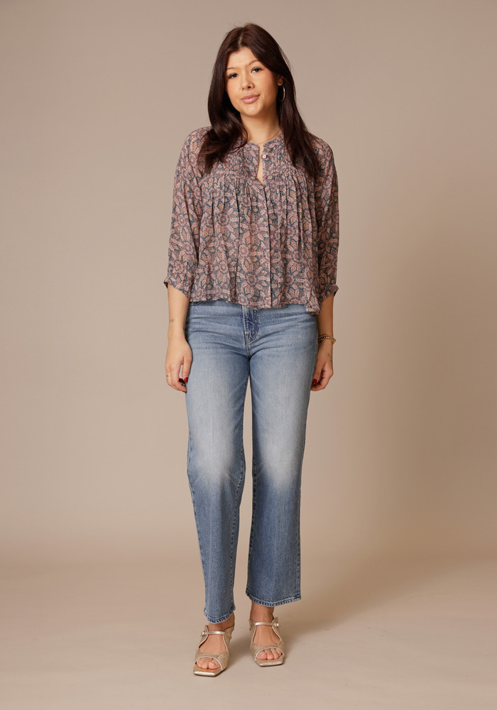 De Pario blouse heeft een typisch doosvolume en 3/4-mouwen met een slanke manchetafwerking. De verborgen knoopsluiting en ronde halslijn zorgen voor een strakke, verfijnde look. Voor extra elegantie zijn er plooien aan het schouderstuk aan de voorkant en fronsjes op het rugpand.