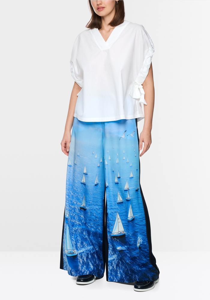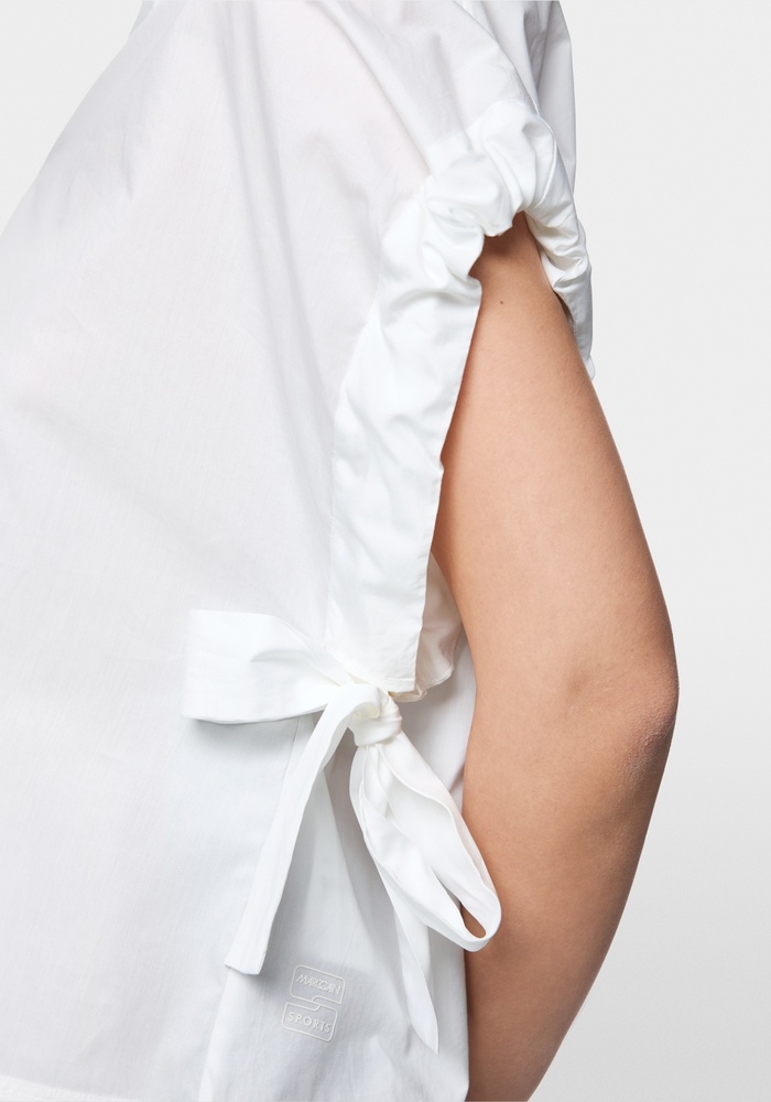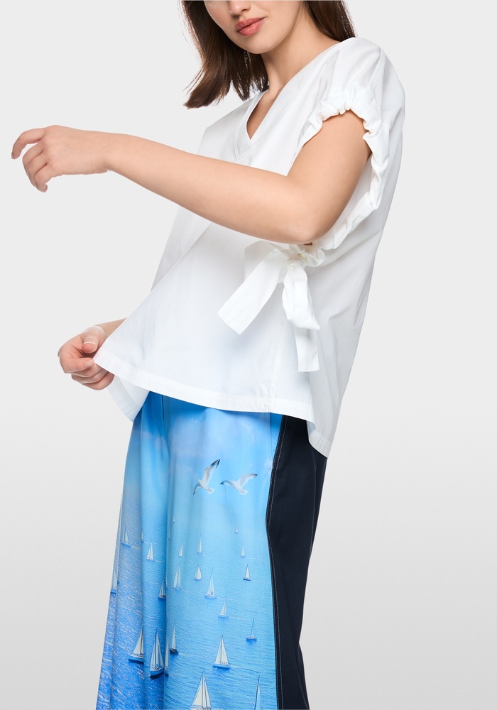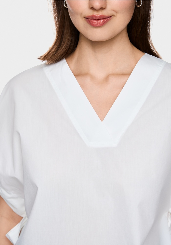 Deze luchtige blouse van Marccain met losse pasvorm en wijde mouwen. De blouse is gemaakt van puur katoen en biedt daardoor een aangenaam licht draagcomfort. Andere details zijn de V-hals en de ruches aan de mouwen met verstelbare bandjes.