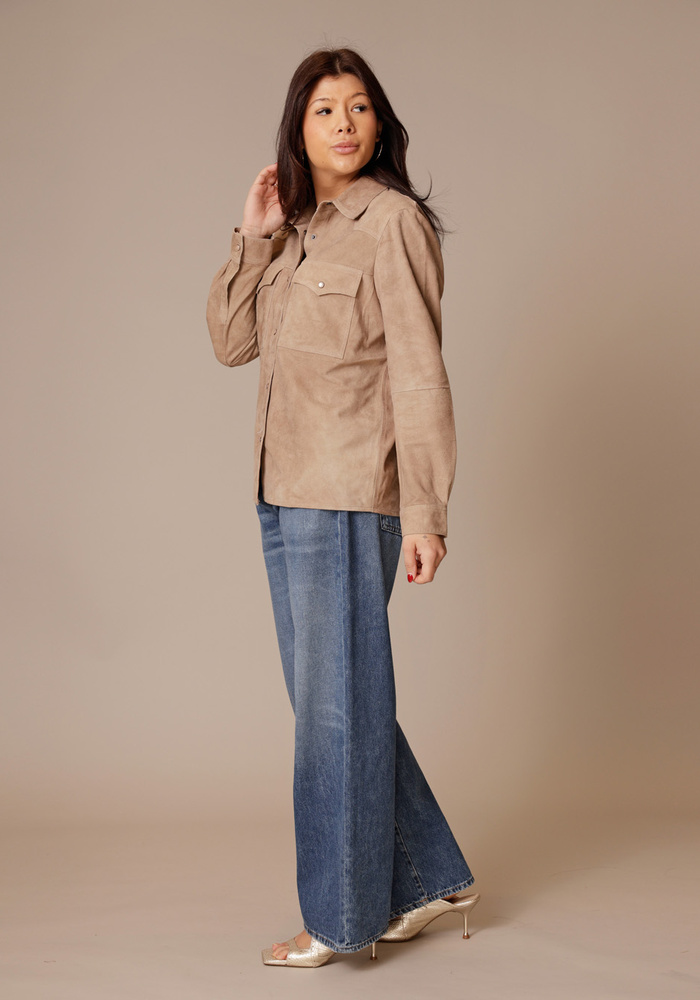 De Havana blouse van Alter Ego is een suede jas met drukknoopjes.