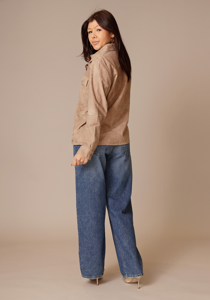 De Havana blouse van Alter Ego is een suede jas met drukknoopjes.