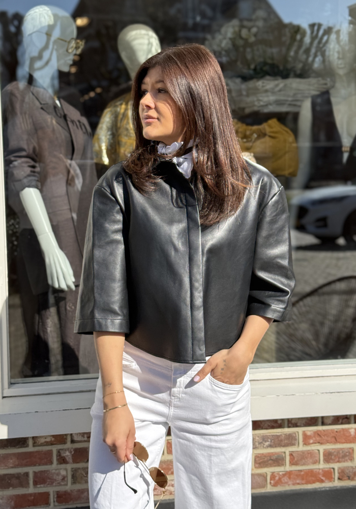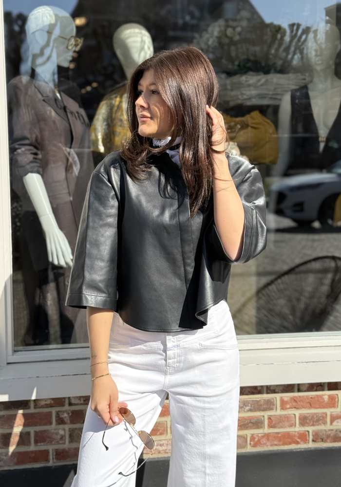 De Mila blouse van Alter Ego is een leren blouse met een korte pasvorm. De blouse heeft korte mouwen en een knoopsluiting aan de voorzijde.