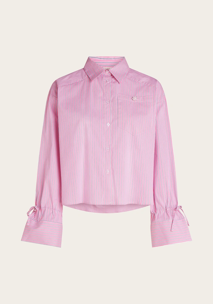 De Bel blouse van Beaumont is uitgevoerd in een zacht streepjespatroon van katoen en polyamide met een vleugje stretch voor extra draagcomfort. Deze korte, boxy blouse heeft een praktische borstzak, sierlijke manchetten met een koord van dezelfde stof, een elegante knoopsluiting aan de voorkant en een dubbele plooi aan de achterkant voor een verfijnde afwerking.